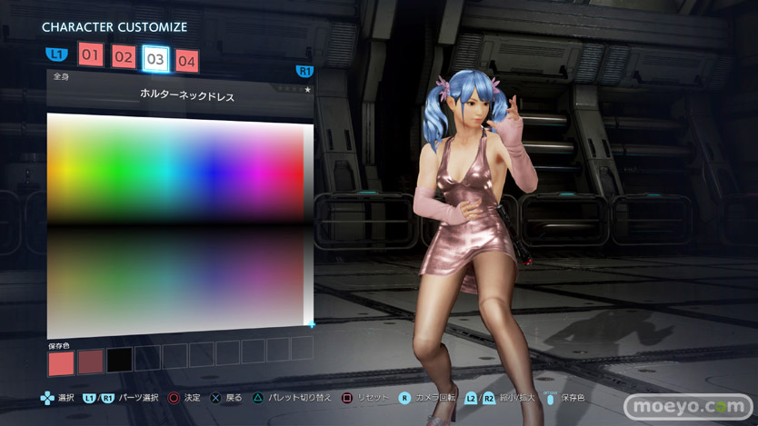こちら女性共有コスの「ホルターネックドレス」ですが、ノーマルカラーだと全般的にストッキングの色が濃いのですが、カラー変更のパレットで真っ白を選択すると、かなり薄い色合いのストッキングとなります。