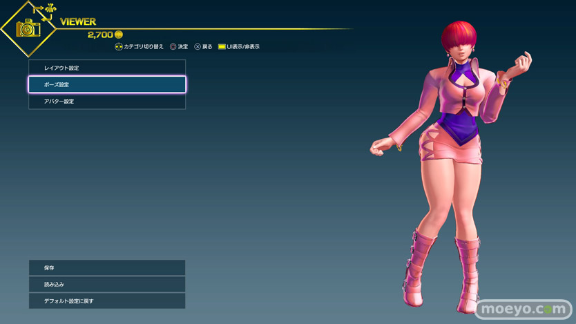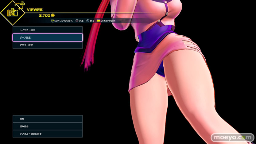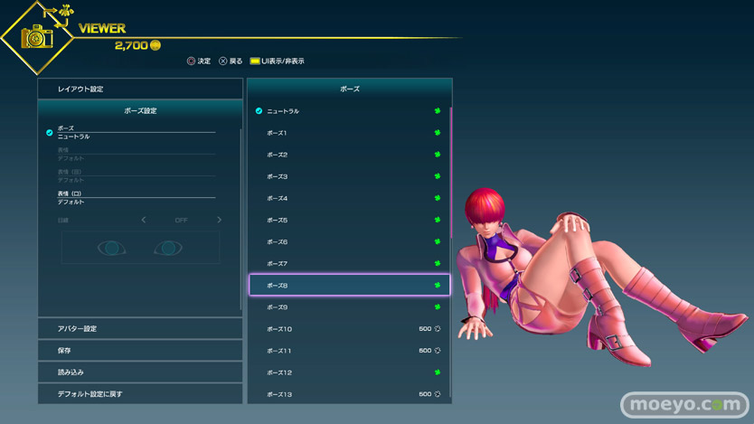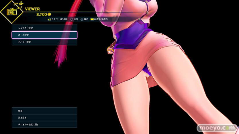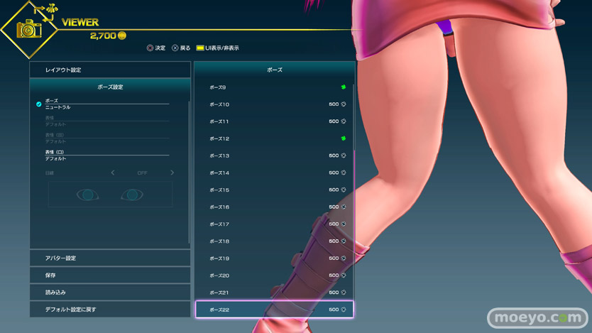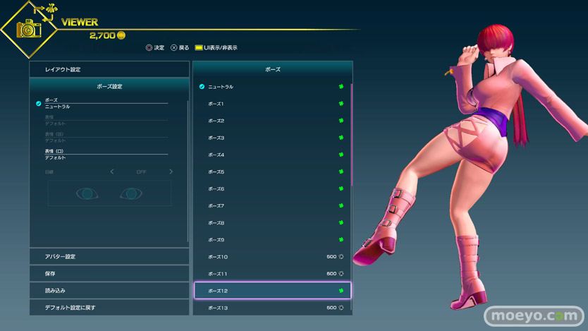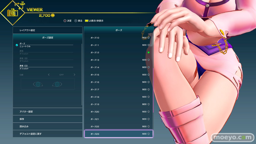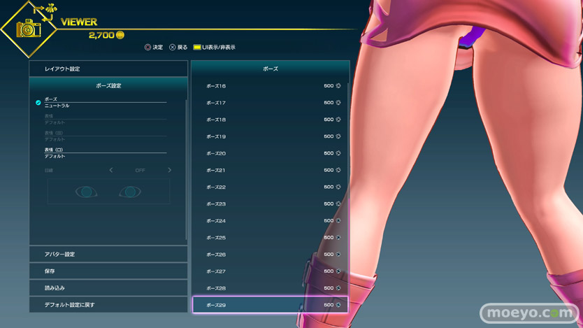 様々なポーズ変更が可能(一部ゲーム内通貨で購入が必要)なので、その中からおパンツ見えそうなポーズをチョイスしてみたところ、500Gで買えるこのローキックポーズ(ポーズ12)がなかなか良さげでした。