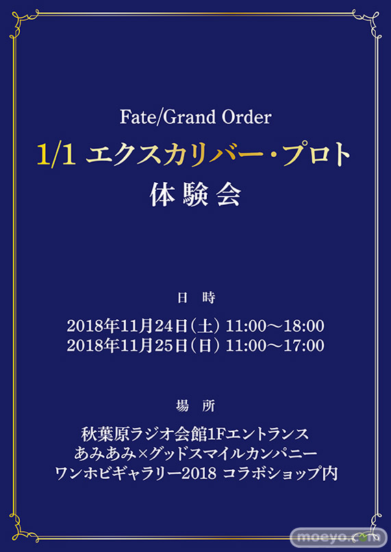 約束された体験--Fate/Grand Order 1/1 エクスカリバー・プロト 体験会等身大サイズでの立体化となる「Fate/Grand Order 1/1 エクスカリバー・プロト」(製造:株式会社グッドスマイルカンパニー)の全国で初の体験会およびワンホビのイベント限定品や蔵出し商品の販売などを行う『あみあみ×グッドスマイルカンパニー ワンホビギャラリー2018 AUTUMN コラボショップ』が、2018年11月24日(土) 11:00~18:00、25日(日) 11:00~17:00 の2日間。 秋葉原ラジオ会館の1階イベントスペースにて開催決定!聖剣を手にとることはもちろん、世界観を再現した背景の前での記念撮影が可能です。【あみあみ】