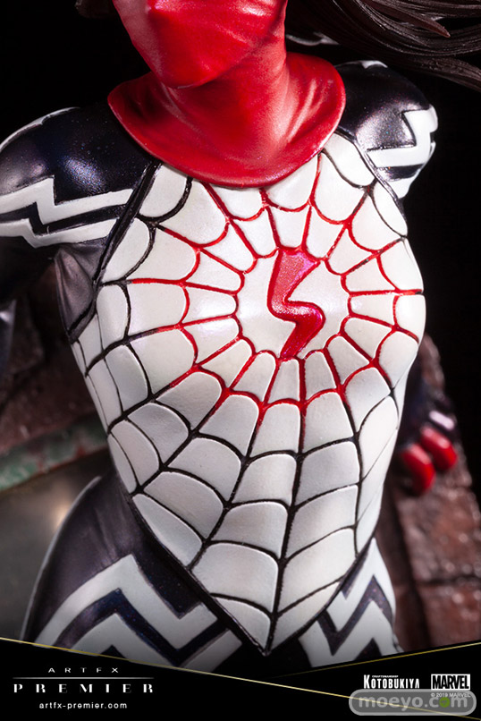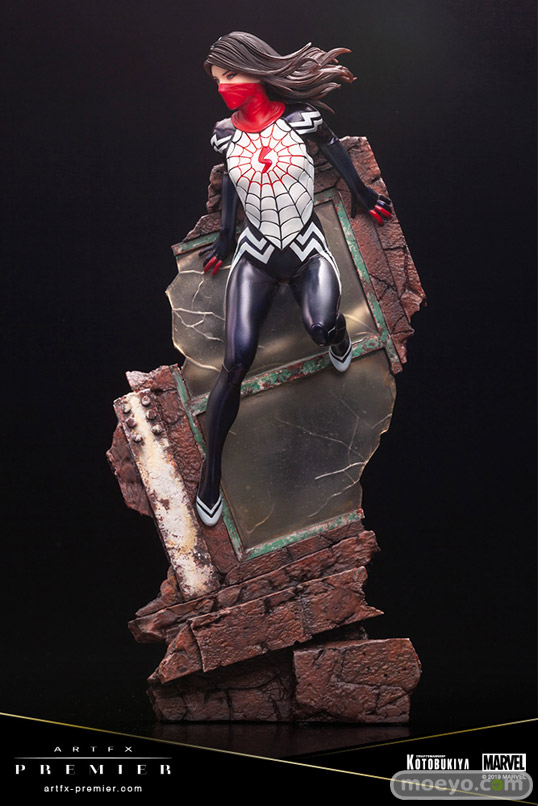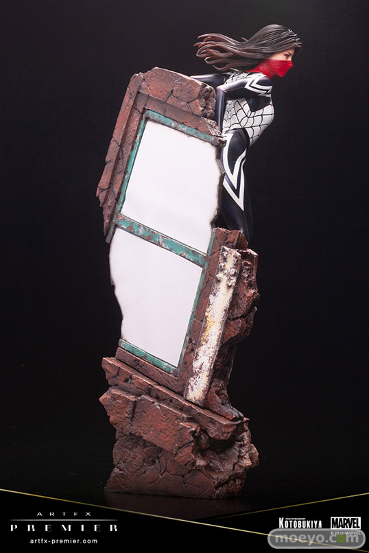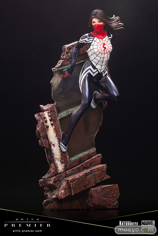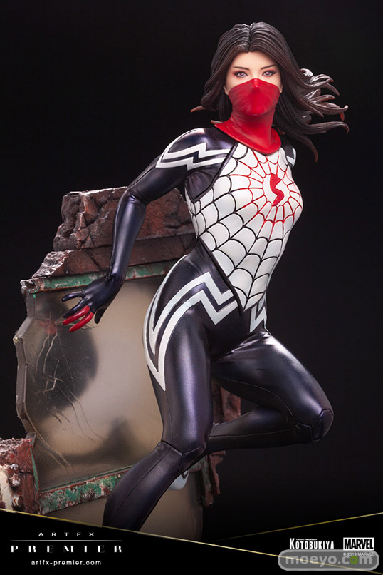 コトブキヤの新作美少女フィギュア「ARTFX PREMIER MARVEL UNIVERSE シルク」が予約受付開始!『精巧に造形、塗装された顔や、リアルなコスチュームなどは従来のシリーズを継承しながらも、本シリーズの最大の注目点は、徹底した『美しさ』を追及。マスクで覆われた3.5cm以下の顔にも徹底的に繊細なペイントを施すことで、キャラクターが持つ魅力を最大限に引き出し、自身の生体ウェブで作られたコスチュームにおいては、複数の色のコーティングを重ねる事で、シルク素材のような優雅な光沢としなやかな肌ざわりを感じさせる質感を再現。さらに彼女が張り付く廃墟の窓には、マジックミラーのような効果を施すことで、その姿を朦朧と映し出し、単に透明素材で表現出来ない至高の美しさが堪能できます。』というもので、原型制作はRESTOREさん。そのサンプルの様子を、画像レビューとしてお伝えします!