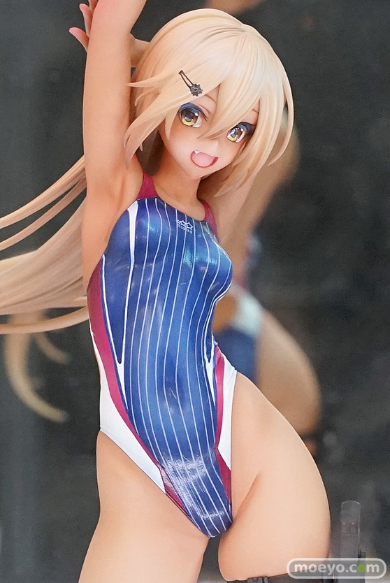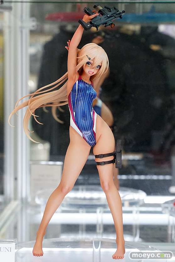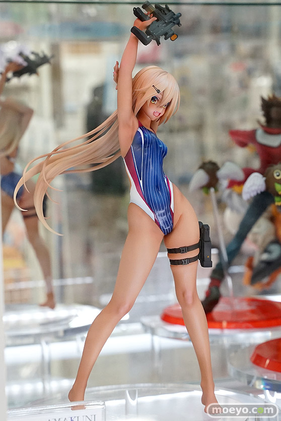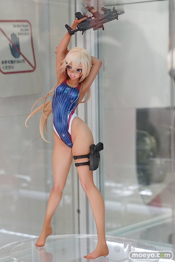 ホビージャパンの新作美少女フィギュア「ARMS NOTE 水泳部のコウハイちゃん」の彩色サンプルが、あみあみ 秋葉原ラジオ会館店で展示!『プールサイドでストレッチをしている場面をイメージし立体化。水泳部らしく鍛えられた美しい肢体、ひねりのある健康的なボディラインを意識し造形。特徴的な競泳水着や武器はもちろん、日焼けした美しい小麦肌も抜かりなく再現し、コウハイちゃんの魅力を追求いたしました。』というもので、お肌部分は「Smooth Skin」加工ですべすべとのこと!原型制作はi-con(藍色空色)さん、銃器製作はにゃばーさん。彩色見本製作は五日市歩さん。製造はAMAKUNIさん。鏡越しに見えたお尻の造形も素晴らしいその展示の様子を、画像レビューとしてお伝えします!