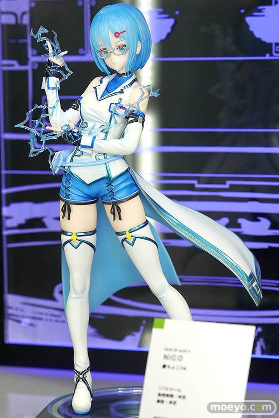白衣をイメージとしつつも、メタリックな青いラインがあしらわれた豪華な衣装デザインを細部に渡り立体化。髪の毛はクリアパーツを使用し、藤ちょこ先生の透明感のあるイラストを表現しました。また、ゲーム中の髪型変更のシチュエーションから「片目隠れ」の髪を別パーツとして付属しています。さらに両手に装着した3つの指輪「EMF」から出るプラズマもクリアパーツとして追加!彼女の持つ様々な魅力を再現できます!NiCOのホームステージである研究所をイメージした台座に立つ姿は、彼女の強さと可愛らしさとを存分に引き出しています。