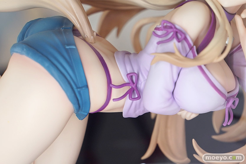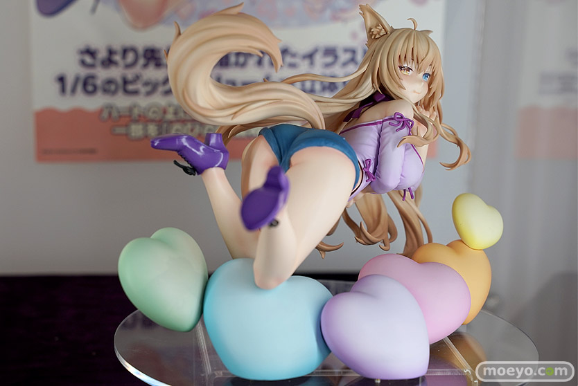 また、ココナツのお気に入りなショートデニムパンツは、なんと!今回のびのび素材で作ってしまいました。ピッタリはかせるもよし、ちょっとずらすもよし、めくったりひっぱったり…マイクロSDカードやsimカードなど紛失しがちな大切な小物をはさんでおいたり!と工夫次第で様々なお楽しみ方が可能です。予備のデニムパンツもついてきますので創造力を働かせて頑張って楽しんでください。カラフルなパステルハートの上にふんわり浮いているポージングも、さより先生のイラストそのままなふんわり感。たわわなバストやグラマラスな腰つきなど細部造形にも注目です。のびのびデニムの下のTバックも必見の出来映えですよ。