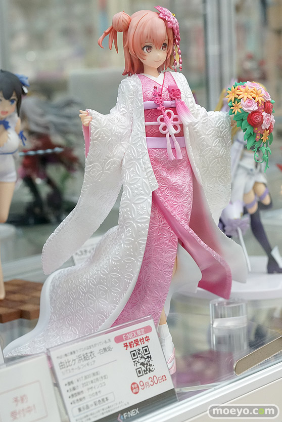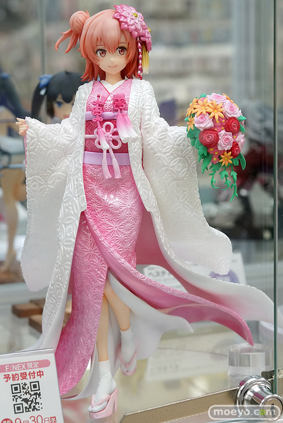 F:NEX(フェネクス)の新作美少女フィギュア「やはり俺の青春ラブコメはまちがっている。完 由比ヶ浜結衣 -白無垢-」の彩色サンプルが、あみあみ 秋葉原ラジオ会館店で展示!『あどけなさを残したほほ笑みと、幸せ気分が隠せず無邪気に駆け寄る仕草に、こちらの心もキュン×2すること間違いなしの可愛さです。白無垢は、繊細な模様を造形で表現し、打掛には白のパール塗装、掛下は、結衣をイメージしたピンク色をチョイスしました。睡蓮の花をモチーフにした髪飾りもポイントです。』というもので、原型制作はデザインココさん。彩色はひのきやさん。その展示の様子を画像レビューとしてお伝えします!