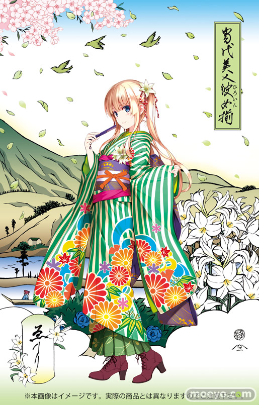 イラストレーターの深崎暮人氏が“ハイカラ”をコンセプトにして描いた英梨々を、名匠・渡辺和夫氏が浮世絵木版画に。遠景に望む山々は、アニメ「冴えない彼女の育てかた」でblessing softwareのメンバーがロケハンに訪れたこともある、あの場所です。