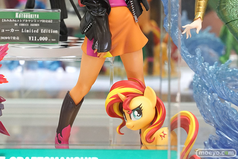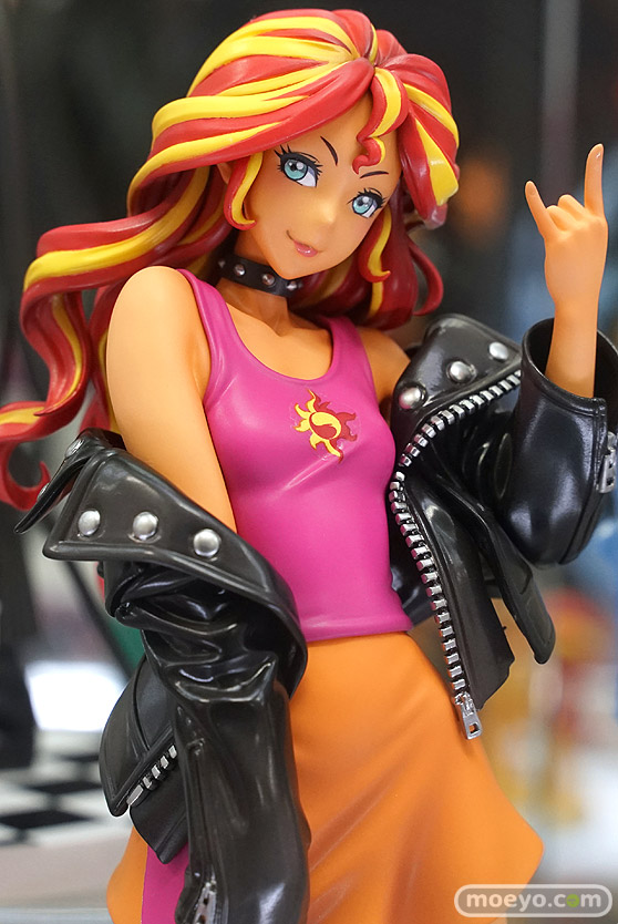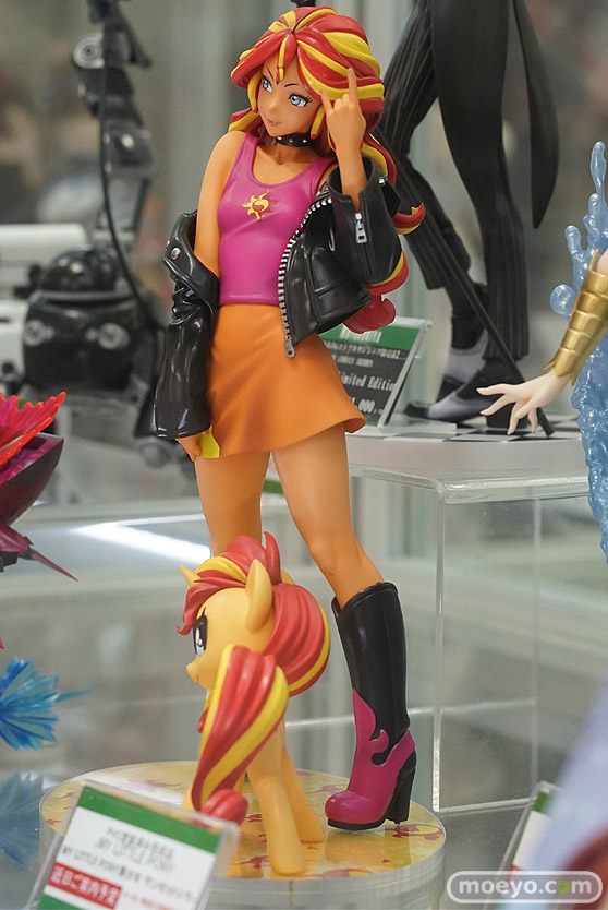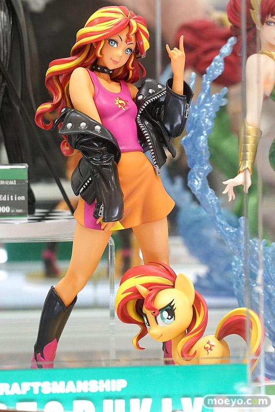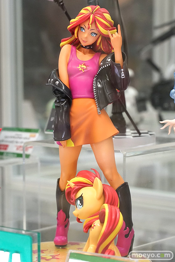 コトブキヤの新作美少女フィギュア「MY LITTLE PONY美少女 サンセットシマ―」が予約受付開始!『特徴的なカラーリングと、シルエットの再現にこだわったヘアスタイルは圧巻。シリーズおなじみ、ポニー姿での目元を彩る立体造形された睫毛も健在です。無骨なライダースを着崩し、不敵にほほ笑む姿は「トモダチの魔法」を知る前、それとも・・・・?』という、山下しゅんやさんのアレンジイラストを元に立体化したもので、原型制作はBISHOUJO姿が燕さん、ポニー姿はコトブキヤさん。あみあみ 秋葉原ラジオ会館店で展示されていた彩色サンプルの様子を、画像レビューとしてお伝えします!