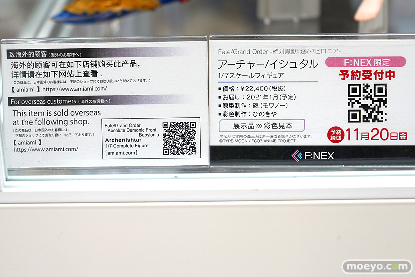 F:NEX(フェネクス)の新作美少女フィギュア「Fate/Grand Order -絶対魔獣戦線バビロニア- アーチャー/イシュタル」の彩色サンプルがあみあみ 秋葉原ラジオ会館店で展示!『美しい髪は毛流れも丁寧に造形し、なめらかな肌は筋肉の質感までも表現、衣装は細かな装飾も丁寧に造形、彩色されています。巨大な宝具「マアンナ」を背に見つめる瞳は“美の女神”に相応しい心奪われそうな美しさです。』というもので、原型制作は磯(モワノー)さん。彩色はひのきやさん。その展示の様子を画像レビューとしてお伝えします!