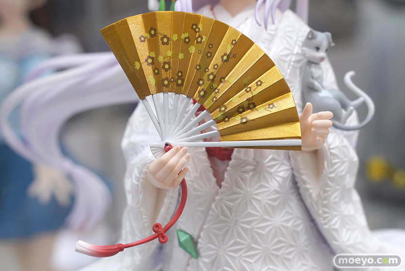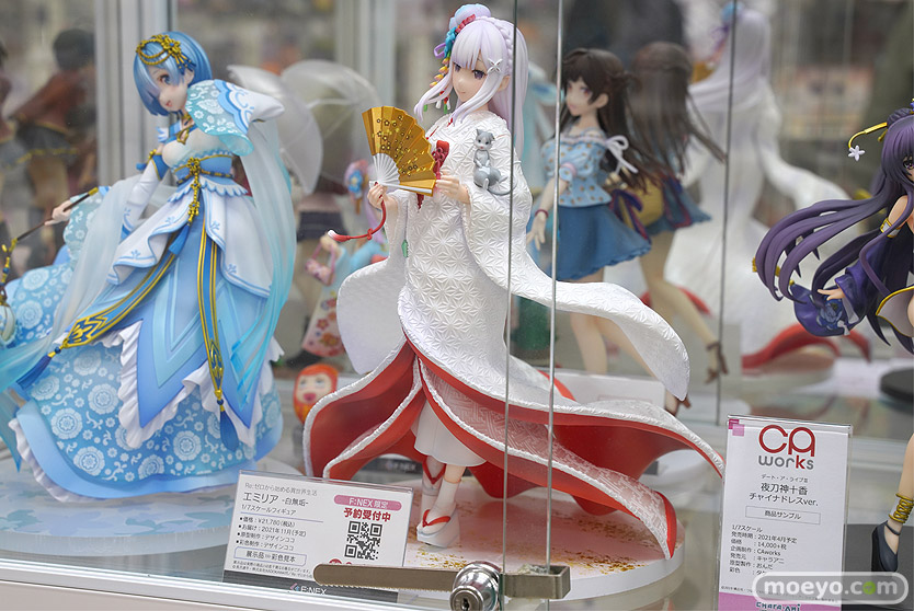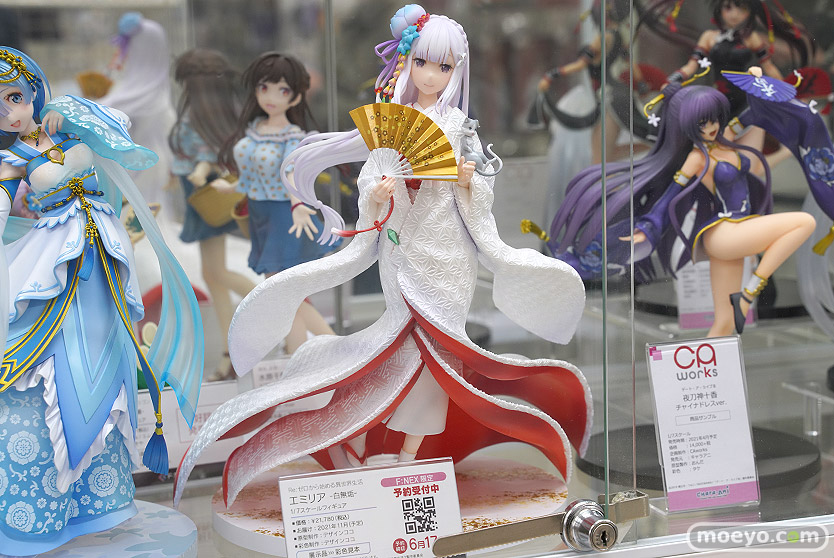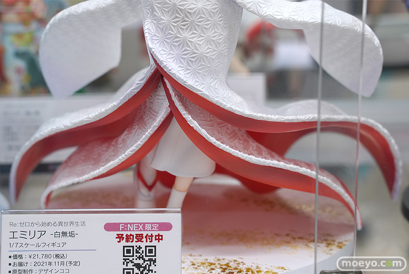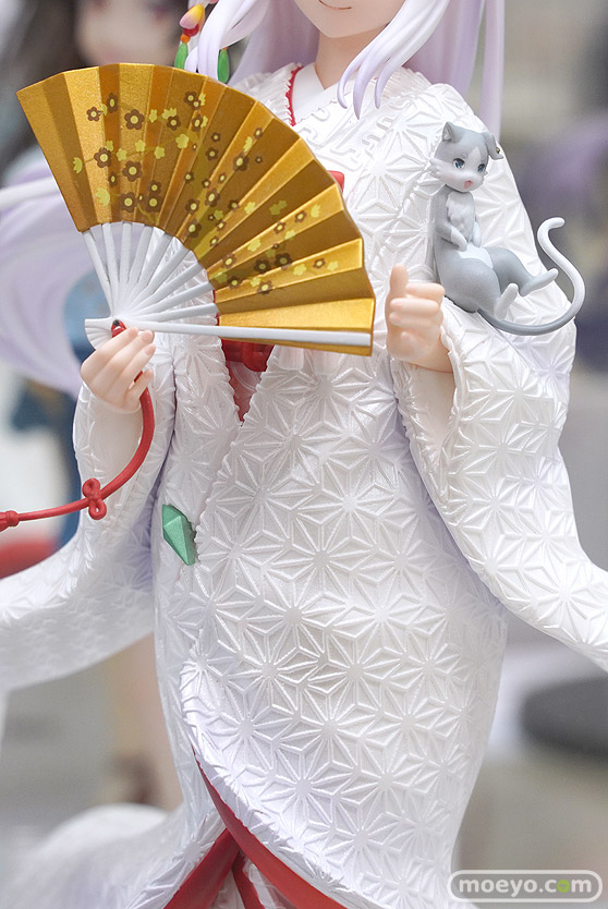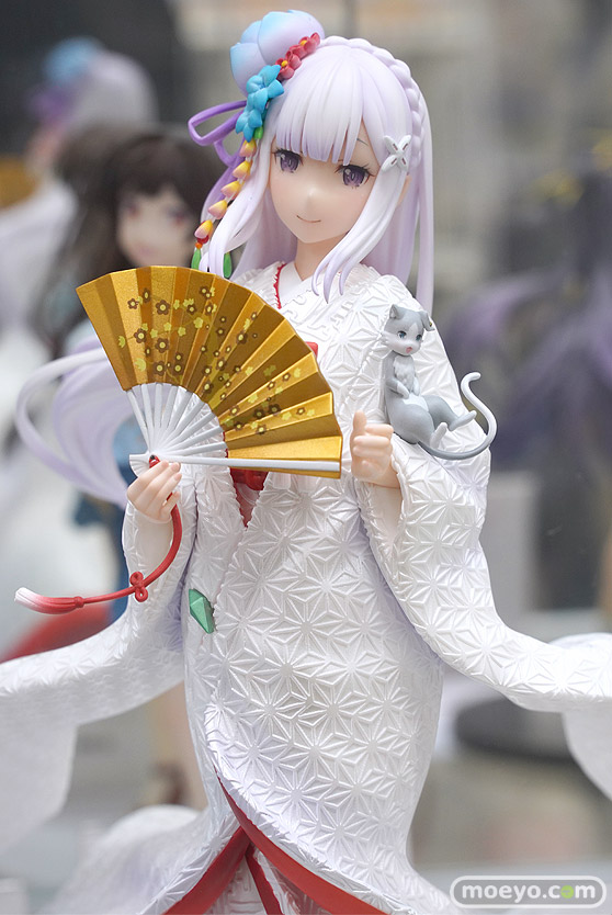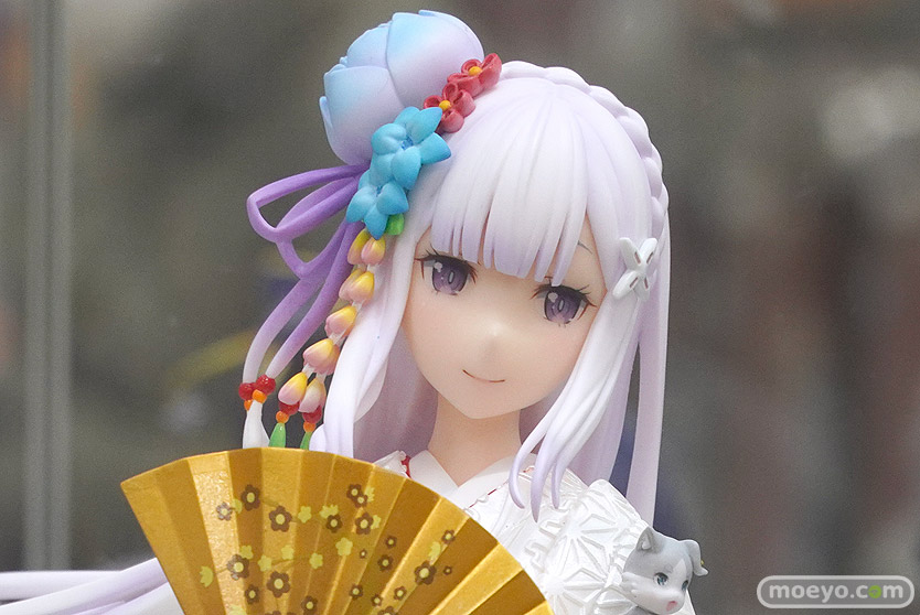 フェネクスの新作美少女フィギュア「Re:ゼロから始める異世界生活 エミリア -白無垢-」の彩色サンプルが、あみあみ 秋葉原ラジオ会館店で展示!『『Re:ゼロから始める異世界生活』より、ハーフエルフの美少女・エミリアがF:NEXオリジナルデザインの美しい白無垢姿でフィギュア化!軽やかになびく白無垢は、生地表面の繊細な模様も造形で表現。打掛と掛下で異なる白色を採用し、打掛にはエミリアをイメージした淡い紫味の白のパール塗装、掛下は、純白のパール塗装を施しました。の花をモチーフにした髪飾りもポイントです。』というもので、原型制作はデザインココさん。その展示の様子を画像レビューとしてお伝えします!