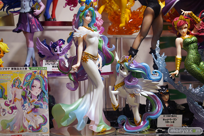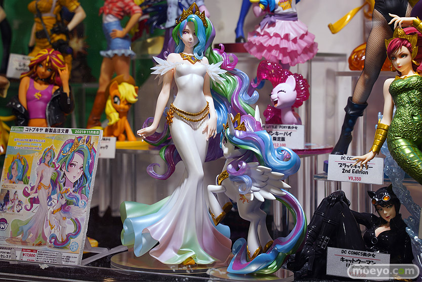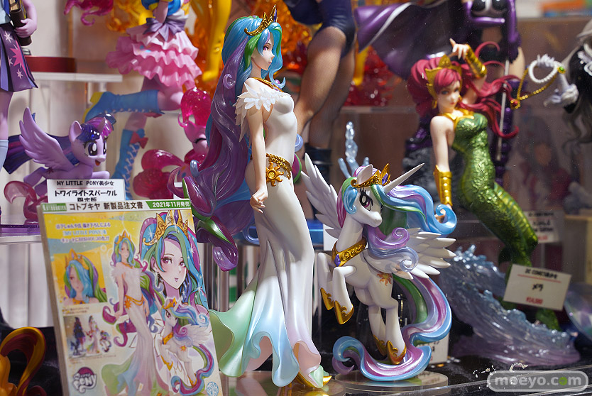コトブキヤの新作美少女フィギュア「MY LITTLE PONY美少女 プリンセスセレスティア」の彩色サンプルが、コトブキヤ秋葉原館で展示!『トワイライトスパークルの師でもある彼女は、エクエストリアを統べる太陽のプリンセス!山下しゅんや氏によるオリジナルデザインのドレスは、不思議な色でゆらめく髪は、クリア素材にパール塗装で、陽だまりのようなふんわりとした質感で表現。』というもので、原型制作はBISHOUJO姿が松本江永さん、ポニー姿はタカヒさん。製作協力はコトブキヤさん。イラストは山下しゅんやさん。その展示の様子を画像レビューとしてお伝えします!