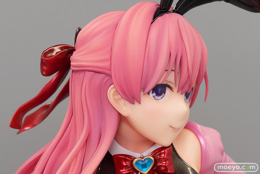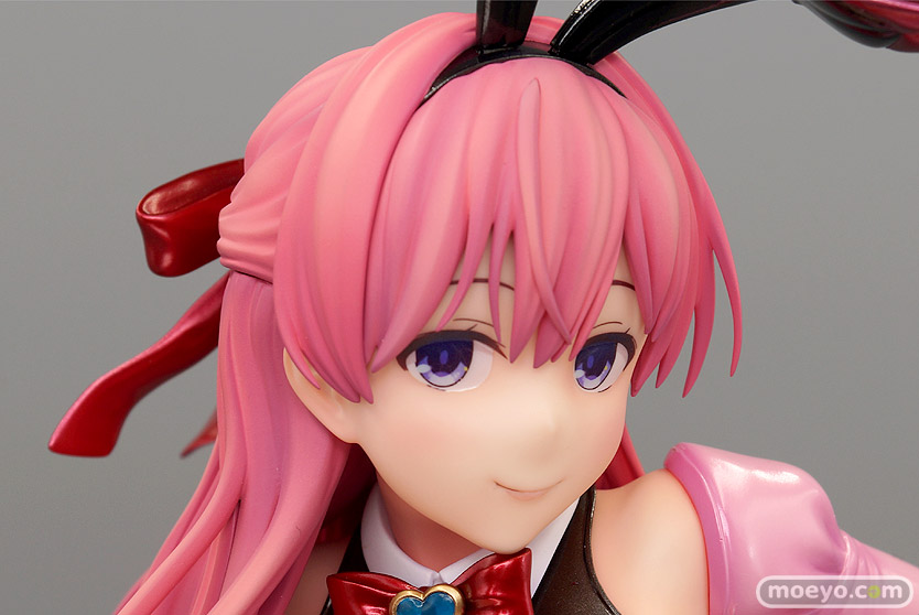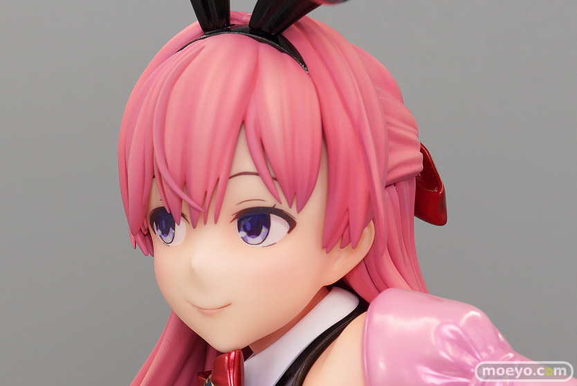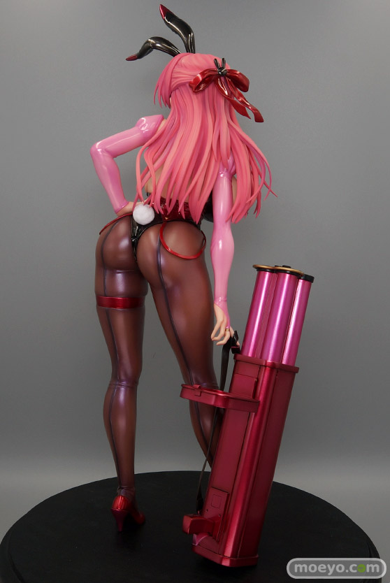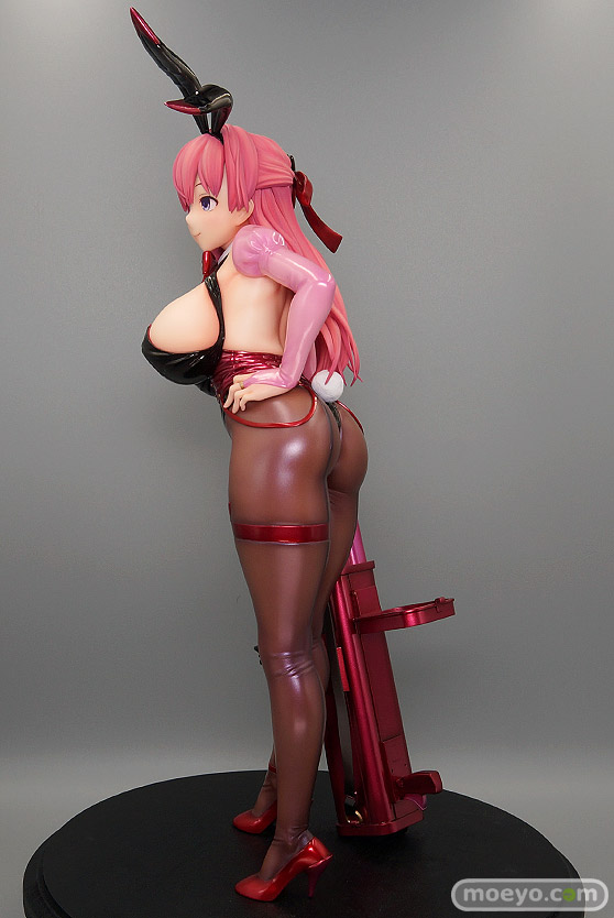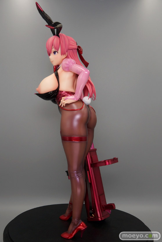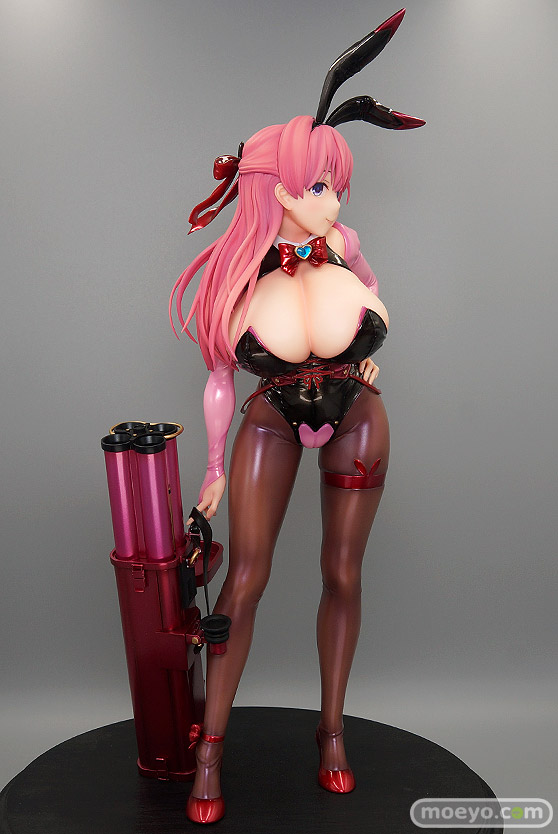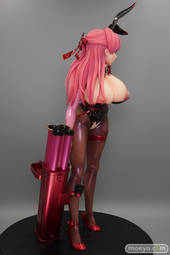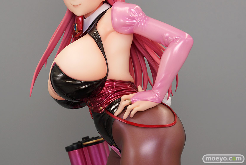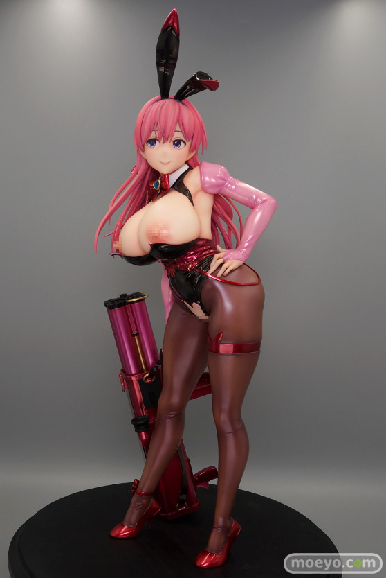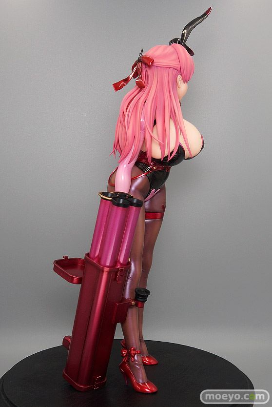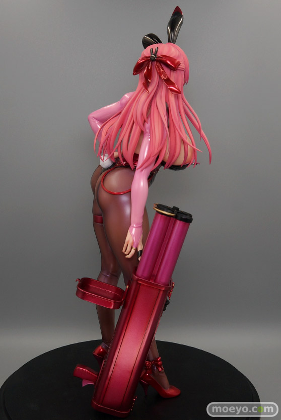 そして、今回はうさ耳まで入れるとFROG史上最大となる全高35.5cm!飾るだけでも大迫力のビッグサイズです。また、左藤空気氏の作風でもある光沢のツヤが美しいバニースーツ型衣装や、そこから零れ落ちそうな豊満な胸にすらりと伸びた二本の脚から覗く重厚感のあるロケラン、全体的にピンク系でまとめながらも各パーツごとの質感の違い…、と細部にわたって楽しめる造形となっております。