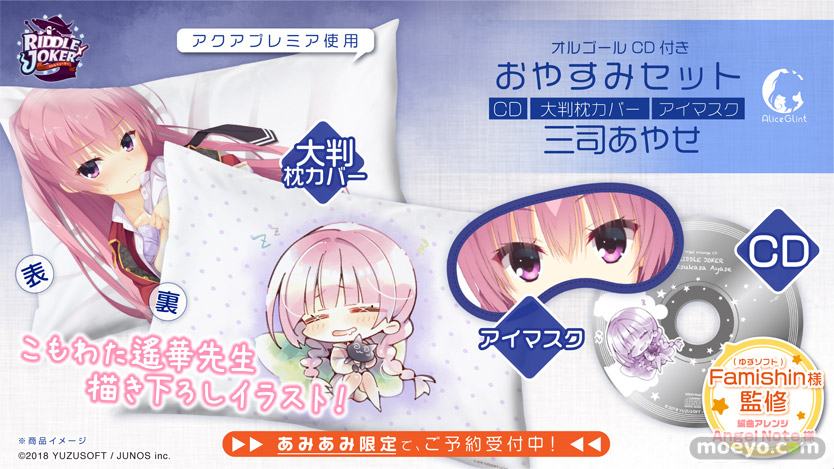 ゆずソフト様、Angel Note様ご協力のもと展開する『オルゴールCD付きおやすみセット』。第2弾は、ゆずソフトがおくる大人気ゲーム『RIDDLE JOKER』より、主人公のクラスメイト「三司あやせ」!楽曲は、Famishin(ゆずソフト)様監修のもと、作中音楽も手掛ける音楽ブランドAngel Note様に楽曲アレンジをご担当いただいた超豪華なオルゴールCDとなっております。可愛いパッケージイラストは、こもわた遙華先生による豪華描きおろし!50~70cmサイズの『大判まくらカバー』は、抱き枕生地でお馴染みアクアプレミア生地を使用するという、こだわり満載な内容で開発いたしました♪ぐっすり眠れて「あやせ」にもなりきれるアイマスクも付いてきます☆【あみあみ】