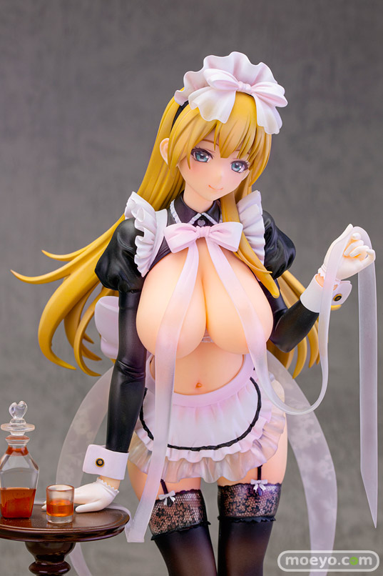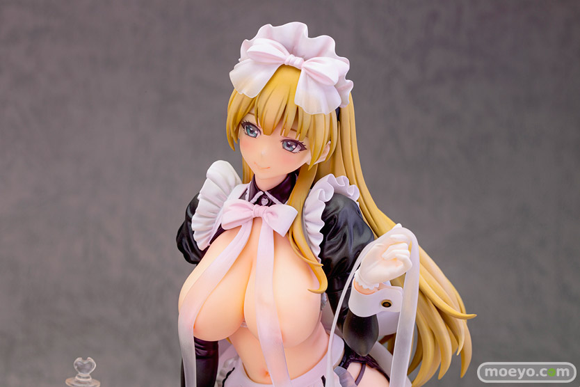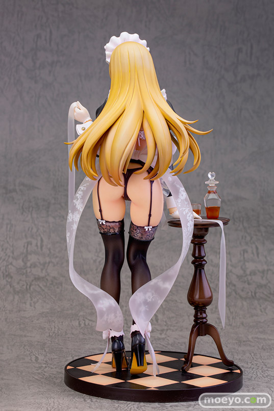 胸元を飾る半透明のリボンパーツや、すらりとした脚を包むストッキング、魅惑的なガーターベルトなど、キュートながらもセクシーな魅力があふれるスタイルとなっています。