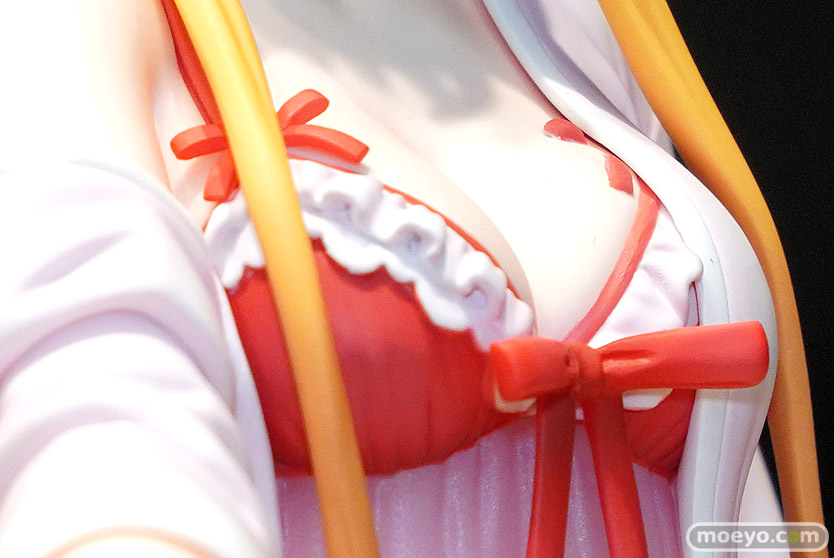透き通るような白い肌に映える赤いランジェリーにはリボンやフリルがあしらわれ、いつも凛々しいアスナの可愛らしい女の子の一面を引き立たせています。整ったプロポーションにスラリとした手足、はだけたガウンから見える華奢な肩など、柔らかな女性らしい造形にも注目。