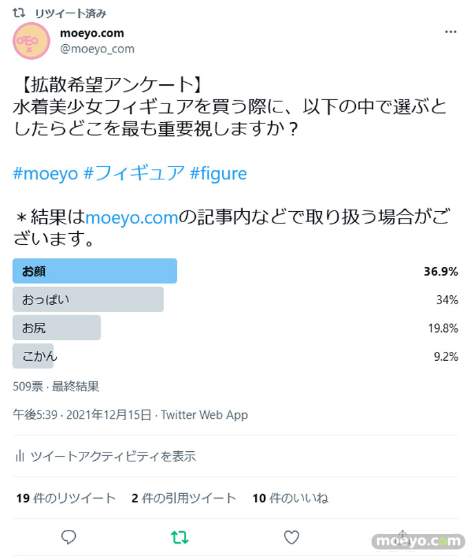 凍結されてしまった2つ目のTwitterアカウント「@moeyo_com」が存命だった時に行った3つのアンケートですが、凍結前に念のためスクショをとっておきました。現状見ることが出来なくなってしまっていますので、アンケート結果を補完する意味も込めて、簡単にではありますがアンケート結果レポートとしてお伝えします!こちらでは「水着美少女フィギュアを買う際に、どこを最も重要視しますか?」の結果を。