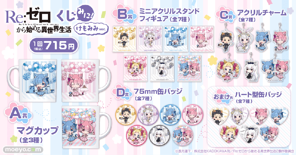 株式会社KADOKAWAは、運営するオンラインくじサービス「くじ引き堂」で、TVアニメ「Re:ゼロから始める異世界生活」オリジナル商品が手に入る“Re:ゼロから始める異世界生活くじみに!けもみみver.”を、2022年2月1日(火)12時より販売中。