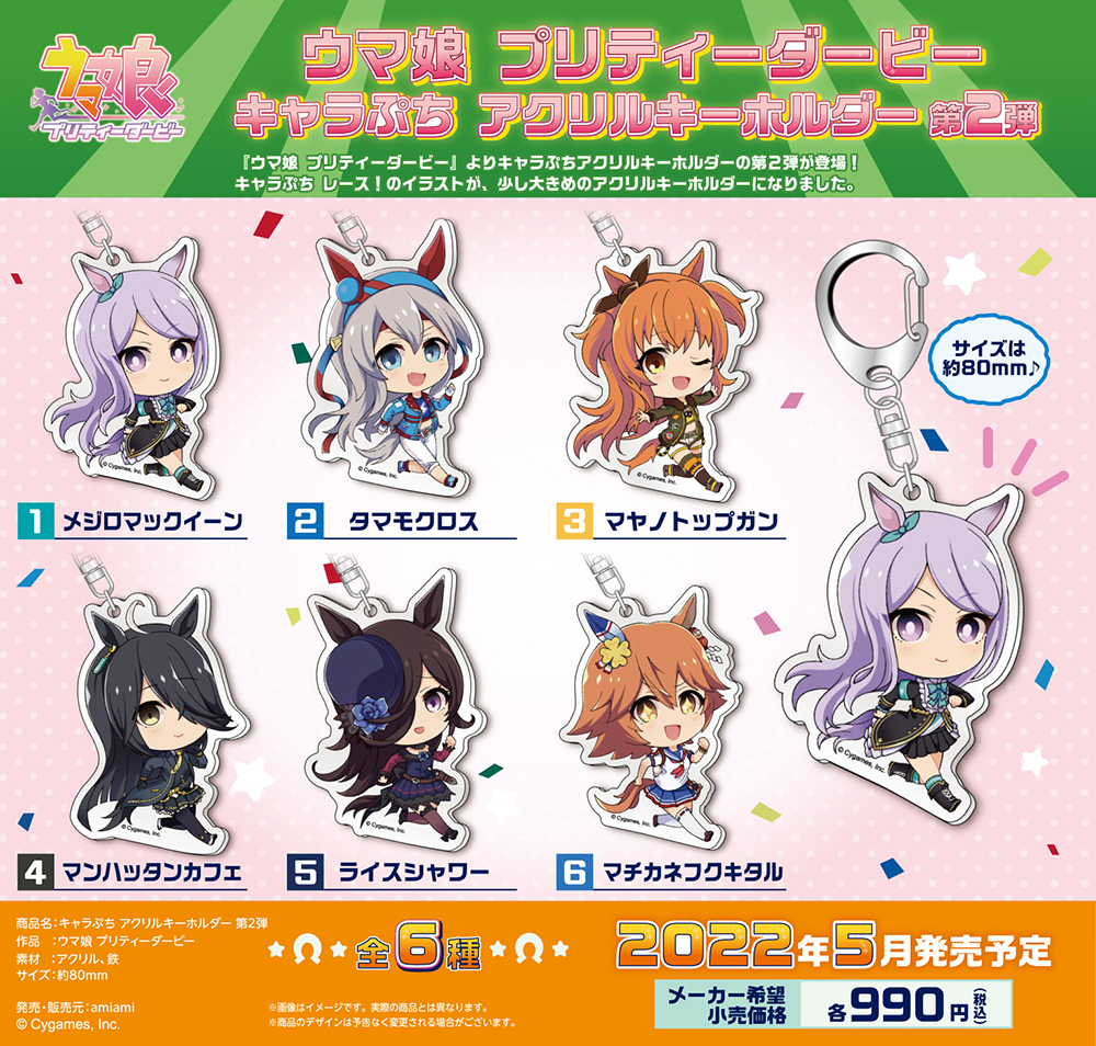 ■ 商品名:ウマ娘 プリティーダービー キャラぷち アクリルキーホルダー 第2弾 ■ 仕様:アクリル、鉄 ■ サイズ:約80mm ■ 価格:990円(税込) ■ 発売:2022年5月予定 |