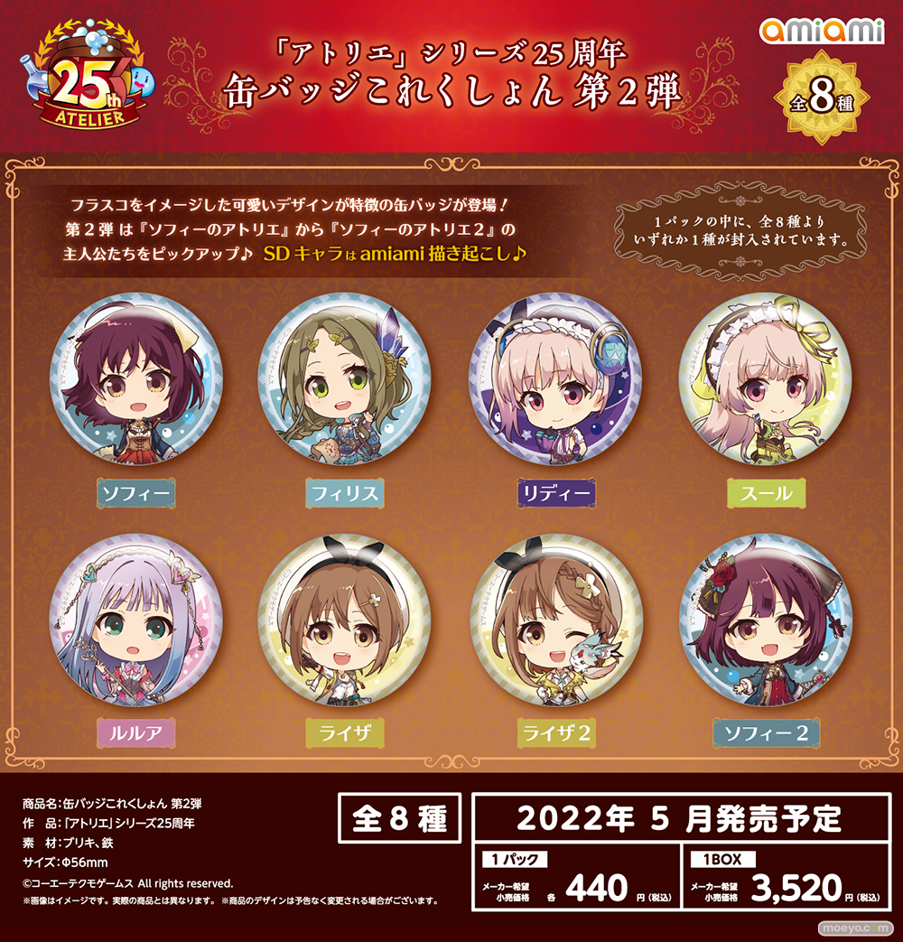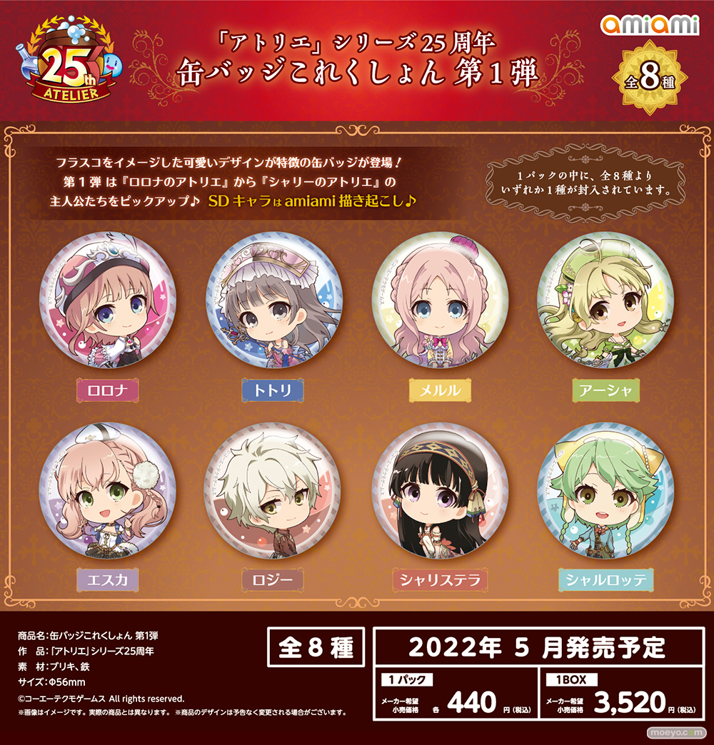■ 商品名:「アトリエ」シリーズ25周年 缶バッジこれくしょん ■ 仕様:ブリキ、鉄 ■ サイズ:φ56mm ■ 価格:440円(税込) ※8パック入りBOXの価格は、440円(税込単価)× 8 = 3,520円(税込)となります。 ■ 発売:2022年5月予定 ■ 生産国:日本 |