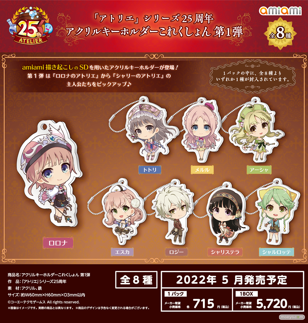 ■ 商品名:「アトリエ」シリーズ25周年 アクリルキーホルダーこれくしょん ■ 仕様:アクリル、鉄 ■ サイズ:約W60mm×H60mm×D3mm以内 ■ 価格:715円(税込) ※8パック入りBOXの価格は、715円(税込単価)× 8 = 5,720円(税込)となります。 ■ 発売:2022年5月予定 ■ 生産国:日本 |