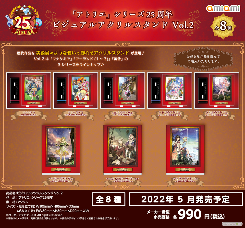 ■ 商品名:「アトリエ」シリーズ25周年 ビジュアルアクリルスタンド ■ 仕様:アクリル ■ サイズ:〈組み立て前〉W105mm×H85mm×D3mm 〈組み立て後〉約W80mm×H80mm×D20mm以内 ※種類によって異なります。 ■ 価格:各 990円(税込) ■ 発売:2022年5月予定 ■ 生産国:日本 |