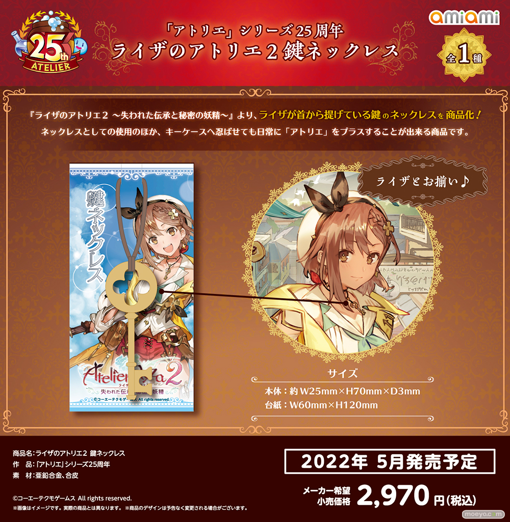 ■ 商品名:「アトリエ」シリーズ25周年 ライザのアトリエ2 鍵ネックレス ■ 仕様:亜鉛合金、合皮 ■ サイズ:本体:約W25mm×H70mm×D3mm 台紙:W60mm×H120mm ■ 価格:2,970円(税込) ■ 発売:2022年5月予定 ■ 生産国:日本 |