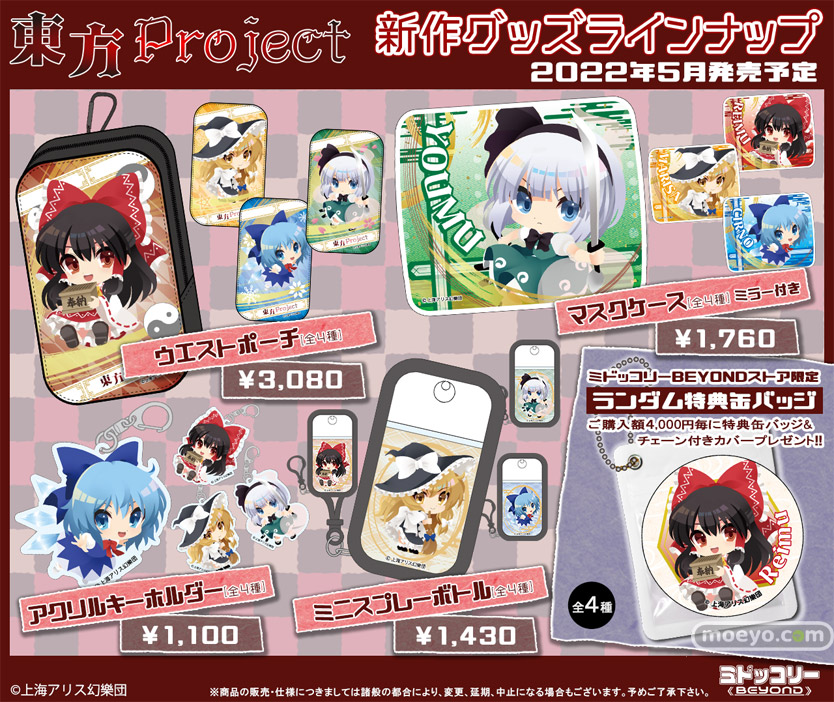 『東方Project』より、霊夢、魔理沙、チルノ、妖夢のデフォルメイラストを使用したかわいい新作グッズが発売決定致しました!商品ラインナップは、「アクリルキーホルダー(全4種)」「ウエストポーチ (全4種)」「マスクケース(全4種)」「ミニスプレーボトル(全4種)」の4点です。【ミドッコリーBEYOND】