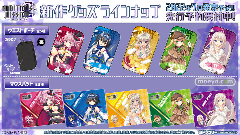 2022年5月27日に発売された人気美少女ゲーム『AMBITIOUS MISSION』より、新作グッズが登場!メインヒロインキャラクター5人を各個別にイメージカラーに合わせたデザインのグッズをご用意させていただきました。 商品ラインナップは、「ウエストポーチ(全5種)」「マウスパッド(全5種)」の2点です。【ミドッコリーBEYOND】
