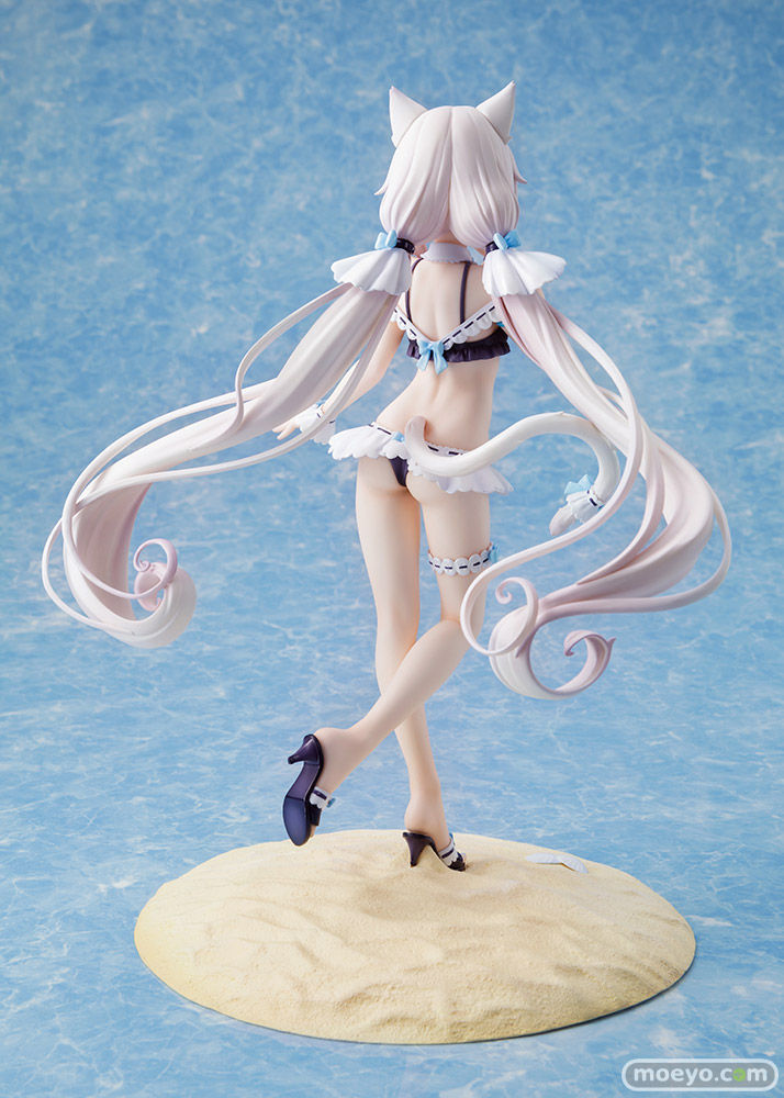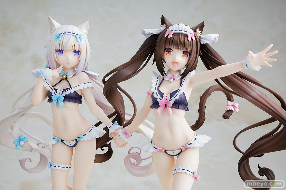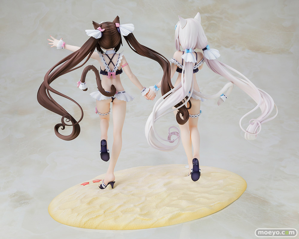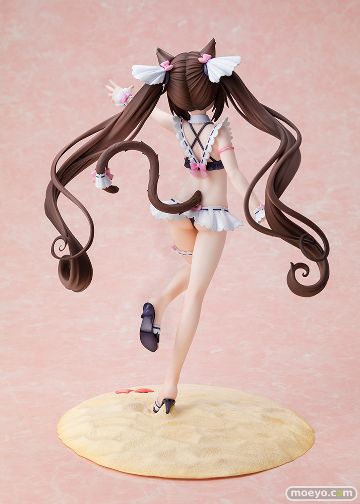 『ネコぱら』ショコラ/バニラ メイド水着ver.は、 さより氏によるイラストをモチーフに、 可愛らしいメイド風の水着に身を包んだ姿で立体化。 しなやかなプロポーションや動きに合わせてふわりと広がるツインテールの髪などを丁寧に表現。 台座も浜辺をイメージしたデザインで再現しています。