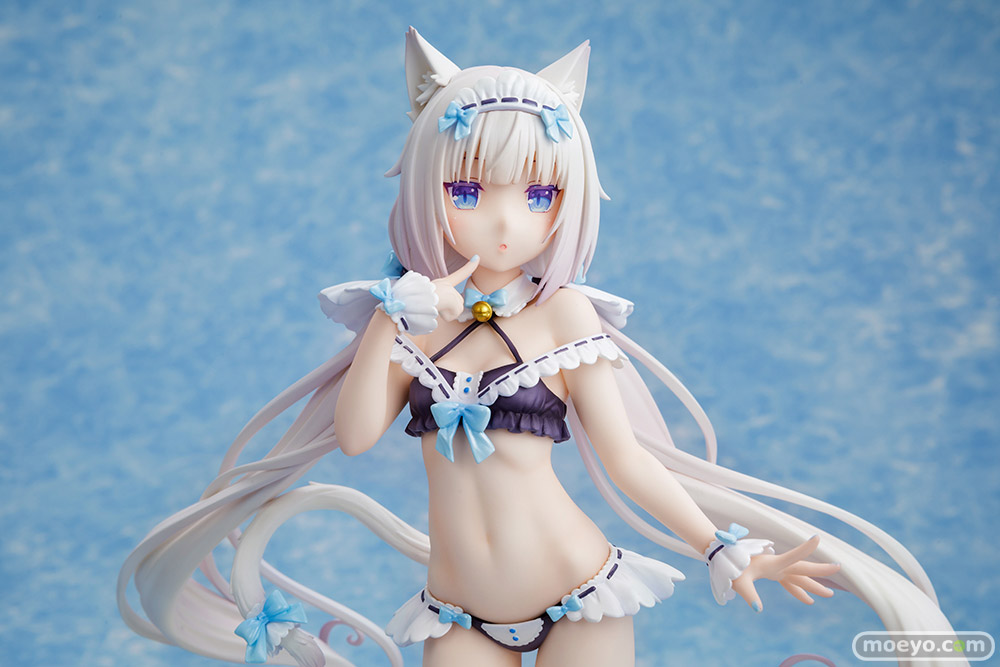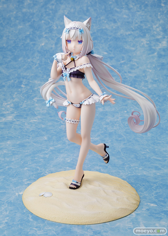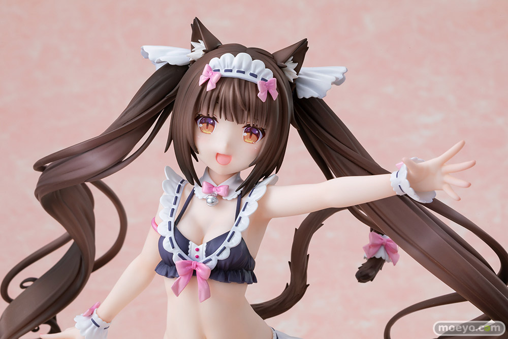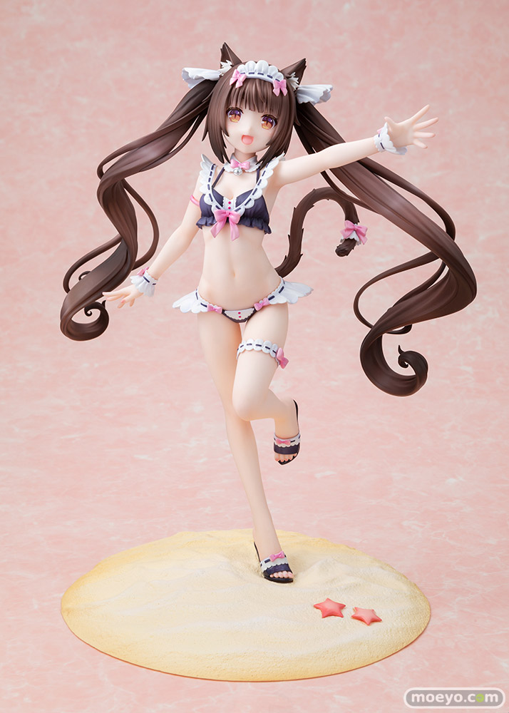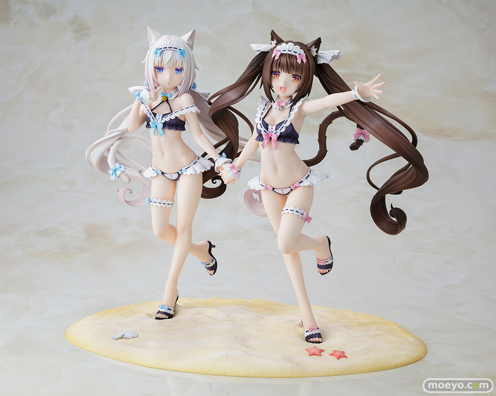 『ネコぱら』ショコラ/バニラ メイド水着ver.は、 さより氏によるイラストをモチーフに、 可愛らしいメイド風の水着に身を包んだ姿で立体化。 しなやかなプロポーションや動きに合わせてふわりと広がるツインテールの髪などを丁寧に表現。 台座も浜辺をイメージしたデザインで再現しています。