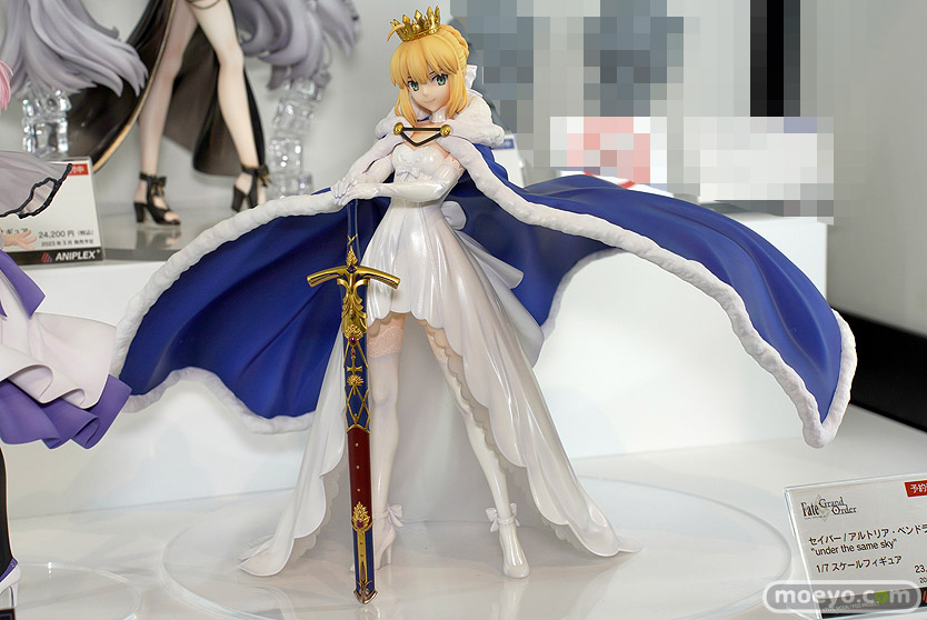 アニプレックスプラスの新作美少女フィギュア「Fate/Grand Order セイバー/アルトリア・ペンドラゴン”under the same sky”」の彩色サンプルが、「ワンホビギャラリー 2022 Spring」の会場で展示!『5周年を祝う記念広告”under the same sky”より武内崇氏が描いた、純白のドレスに身を包んだ威風堂々たる立ち姿のアルトリアを立体化。彼女の印象的な青いマントが大きく風になびく様を忠実に再現し、ボリューム感もある仕上がりに。こちらを見つめ微笑む表情は穏やかながらも、騎士王としての風格があらわれています。』というもので、原型制作はゆうこ~ん(knead)さん。制作協力は株式会社リボルブさん。彩色はいなば(リボルブ)さん。その展示の様子を画像レビューとしてお伝えします!