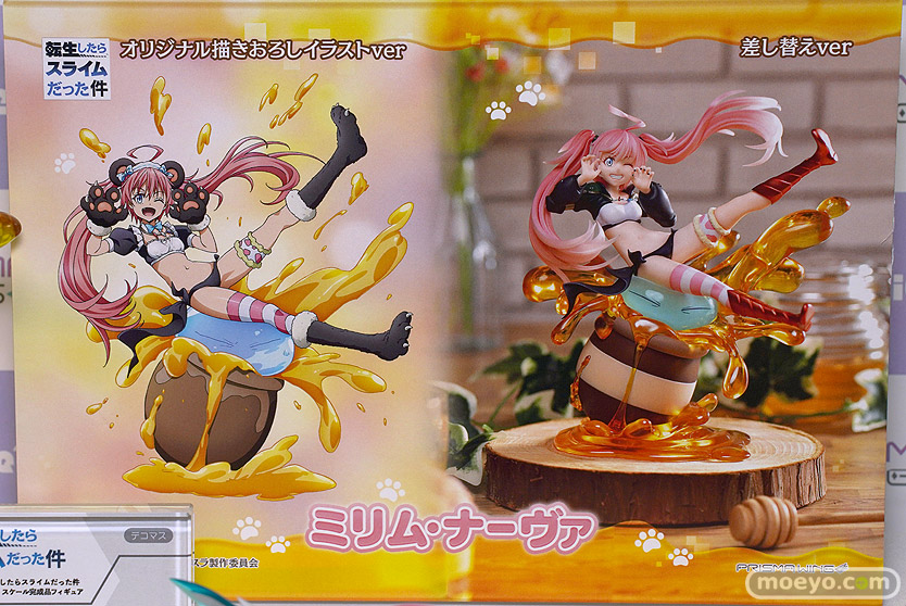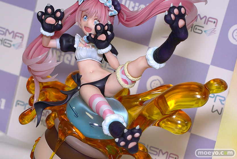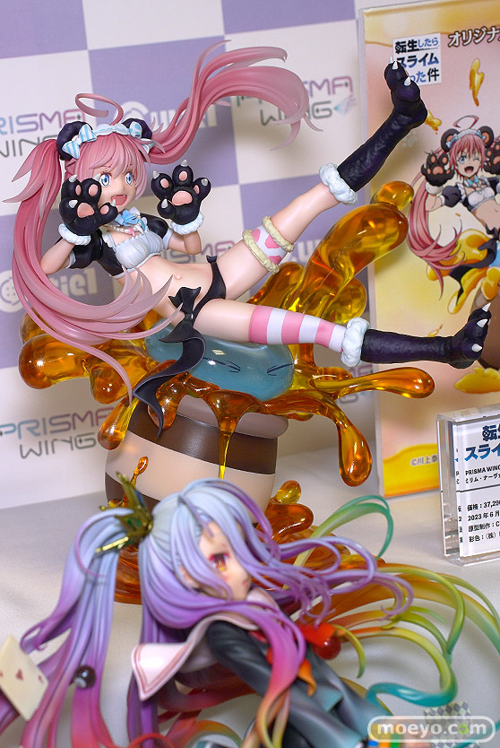 プライム1スタジオの新作美少女フィギュア「PRISMA WING 転生したらスライムだった件 ミリム・ナーヴァ」の彩色サンプルが、「2022夏 ホビーメーカー合同展示会」の会場で展示!『ハッピーな表情、奔放なポージングはミリムのイメージ通り。ピンクのツーサイドアップヘア、ポットからあふれ出るハチミツ、ちょっと迷惑そうな親友(マブダチ)のリムルもクリアパーツでみずみずしく表現しました。そして注目してほしいのが付属の差し替えパーツ。なんとおなじみのコスチュームに加え、オリジナルデザインのベアベアメイド服も楽しめます。』というもので、展示はその「ベアベアメイド服」状態となっていました。原型制作はCKBさん。彩色は(株)Pawrettaさん。その展示の様子を画像レビューとしてお伝えします!