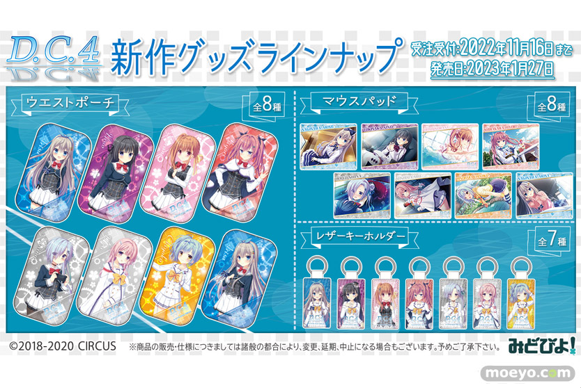 『D.C.4~ダ・カーポ4~』新作グッズ登場!C101先行販売!商品ラインナップは、「ウエストポーチ (全8種)」「マウスパッド (全8種)」「レザーキーホルダー(全7種)」の3点です。また、コミックマーケット101「みどびよ!ブース[NO.926]」にて、今回ご紹介した新作グッズの先行販売を行います。別途、「D.C.4 ~ダ・カーポ4~」C101限定グッズも販売を予定しておりますので、詳細はC101みどびよ!特設ページをチェックしてください。【みどびよ!】