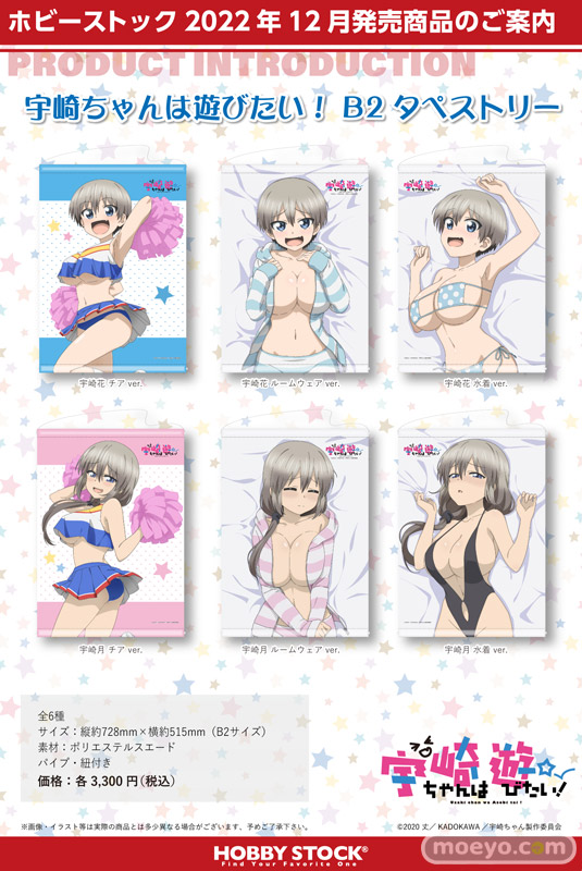 ■ 商品名:「『宇崎ちゃんは遊びたい! B2タペストリー』6種」 ■ 発売元:ホビーストック ■ サイズ:縦約728mm×横約515mm(B2サイズ) ■ 素材:ポリエステルスエード パイプ・紐付き ■ 価格:各3,300円(税込) |