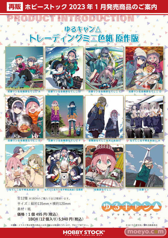 株式会社ホビーストックは、本日11月10日より、下記弊社企画商品の再販分予約受付を開始したことをお知らせいたします。『ゆるキャン△ トレーディングミニ色紙 原作版』『ゆるキャン△ トレーディングミニ色紙 原作版 vol.2』『ゆるキャン△ 志摩リンのストライプマフラー』全国のホビー・アニメショップ、WEB通販サイトなどでお買い求めいただけます。