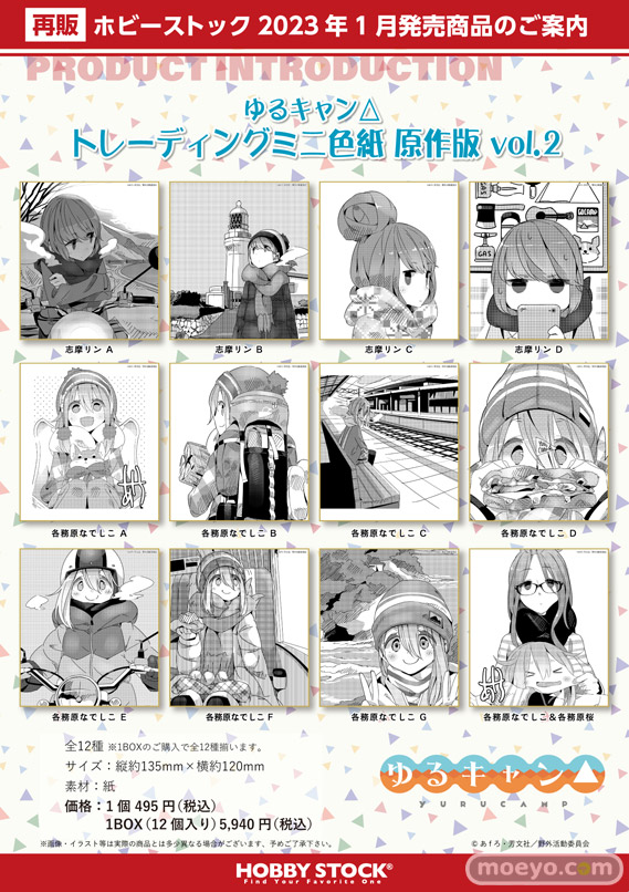 ■ 商品名:『【再販】ゆるキャン△ トレーディングミニ色紙 原作版 vol.2』 ■ 発売元:ホビーストック ■ 商品仕様:1BOX12枚入り 全12種 ※1BOXのご購入で全12種揃います。 ■ サイズ:縦約135mm×横約120mm ■ 素材:紙 ■ 価格:1個 495円(税込)/1BOX(12個入り) 5,940円(税込) ■ 発売:2023年1月 |