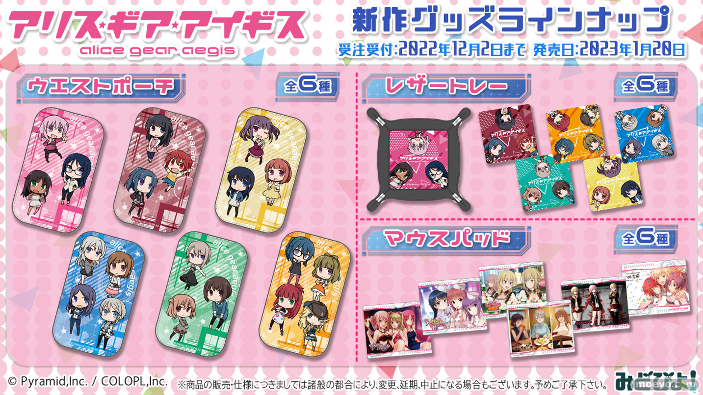 スマートフォン用武装カスタマイズアクションゲーム「アリス・ギア・アイギス」より、新作グッズが発売決定致しました!商品ラインナップは、「ウエストポーチ (全6種)」「レザートレー(全6種)」「マウスパッド (全6種)」の3点です。【みどびよ!】