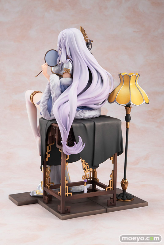 アレンジされたドレスに身を包み、装飾の施された机に腰掛ける姿は、ゴージャスなファーを纏い優雅そのもの。団扇でそっと隠す微笑、さらりと広がる髪のライン、片方だけ脱げた靴など、上品でいながら普段のエミリアとはどこか違った雰囲気が演出されており、見応え抜群な逸品に仕上がっています。