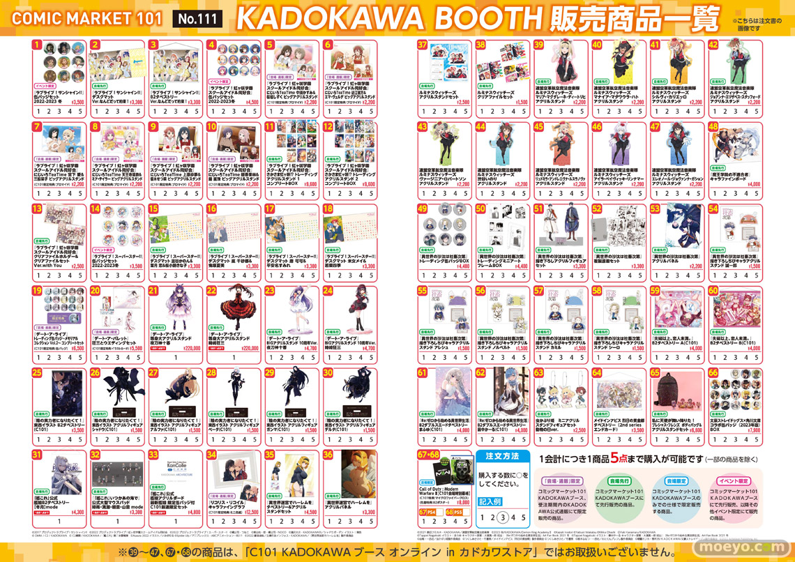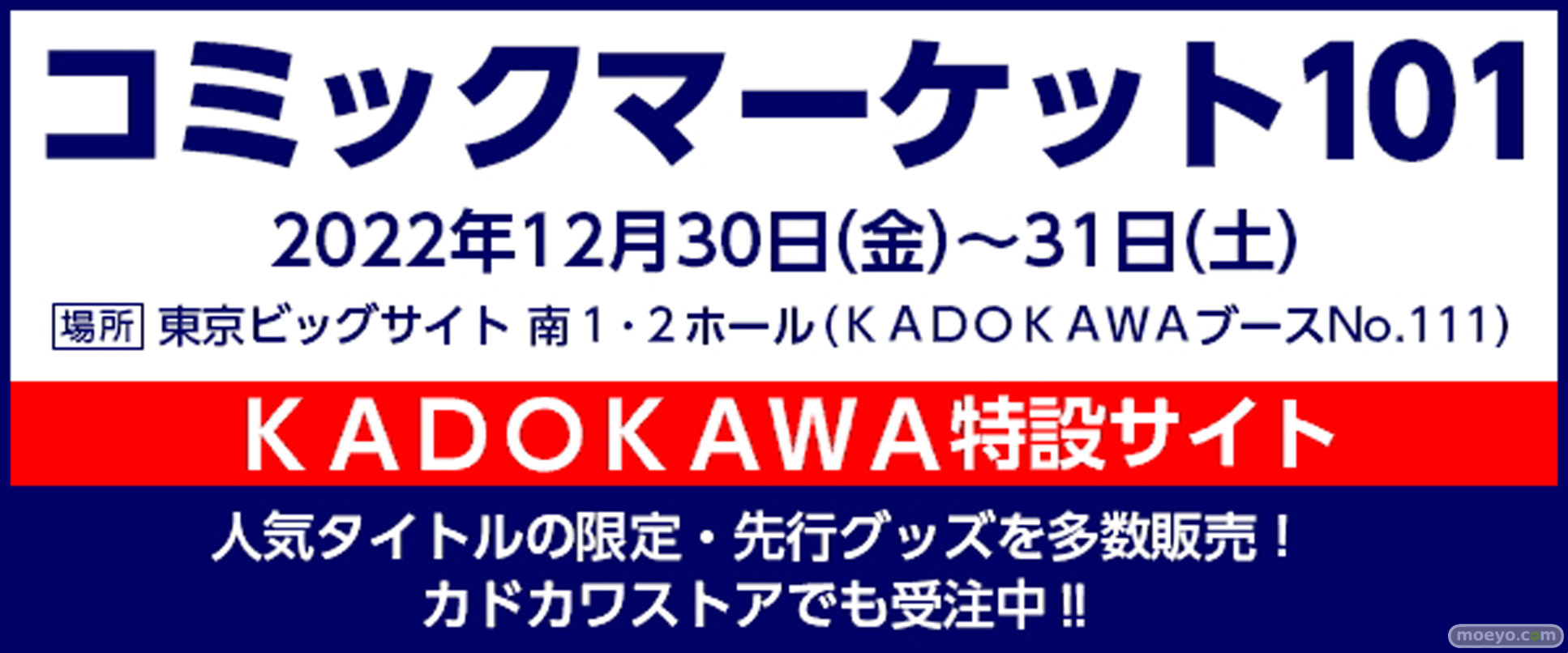 KADOKAWAの公式オンラインショップ カドカワストアでは、ブースで販売する商品の先行受注を受付中です。詳細はカドカワストア内C101特設ページをご確認ください。また、C101商品を対象とした送料無料キャンペーンも実施しているので、この機会をお見逃しなく!