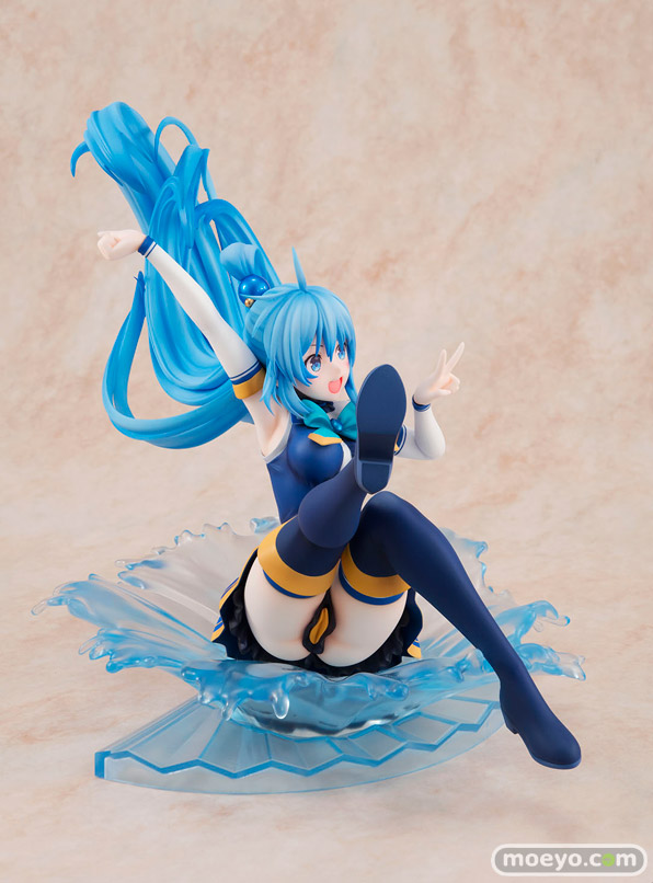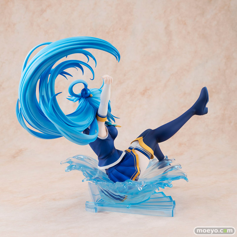 本作品より、ヒロインの一人「アクア」が1/7スケールでフィギュア化。2017年に発売された『三嶋くろね画集 Cheers! この素晴らしい世界に祝福を!』より、元気いっぱいなアクアのイラストを元に立体化しました。落下直後を見事に再現した逆巻く髪の流れや胸の揺れ、服の皺など見事に再現しています。そんな彼女を受け止める台座は「水を司る女神」にふさわしい水芸風となっています。