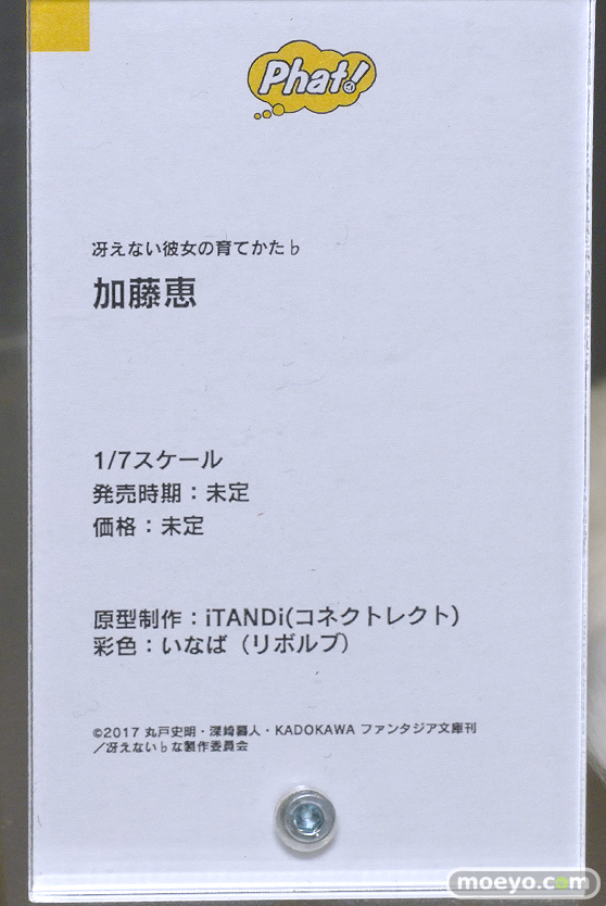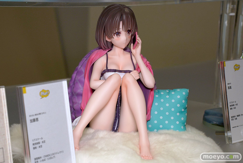 ファット・カンパニーの新作美少女フィギュア「冴えない彼女の育てかた♭ 加藤恵」の彩色サンプルが、「2023春 ホビーメーカー合同展示会」の会場で展示!『TVアニメ『冴えない彼女の育てかた♭』より、メインヒロインの「加藤恵」が1/7スケールでフィギュア化です。薄手のルームウェア姿でくつろぎつつスマホで通話する姿を立体化致しました。人目を気にしないプライベートな空間ならではのリラックスしたスタイルや深崎暮人氏の繊細なタッチや複雑な色の構成を意識した彩色も見どころとなっています。』というもので、原型制作はiTANDi(コネクトレクト)さん。彩色はいなばさん。その展示の様子を画像レビューとしてお伝えします!