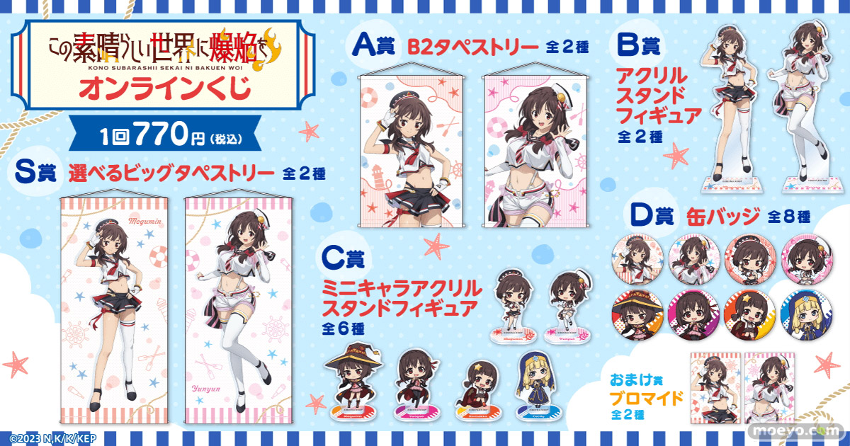 株式会社KADOKAWAは、運営するオンラインくじサービス「くじ引き堂」において、アニメ「この素晴らしい世界に爆焔を!」オリジナル商品が手に入る「この素晴らしい世界に爆焔を! オンラインくじ」を、2023年6月13日(火)17時より販売します。【KADOKAWA】