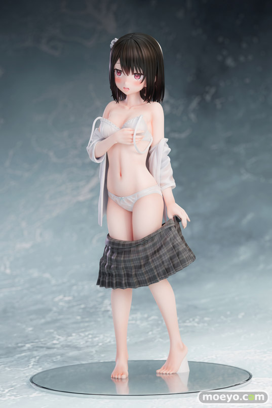 カントク氏オリジナルイラストより看板娘『しずくちゃん』の再販が決定!びしょ濡れで帰宅したその後を切り取ったオリジナルイラストを忠実に立体化!濡れたシャツや下着の透け感はもちろん、半泣きになったしずくちゃんの両目に浮かぶ涙もしっかり表現されていて可愛らしい仕上がりです。イラストでは描かれていない脱ぎかけのスカートや足元、肩から落ちたシャツから覗く背中まで、着替え途中のしずくちゃんをあらゆる角度からご堪能いただけます。可愛いしずくちゃんの魅力を詰め込んだスケールフィギュアをぜひお手元でお楽しみください。