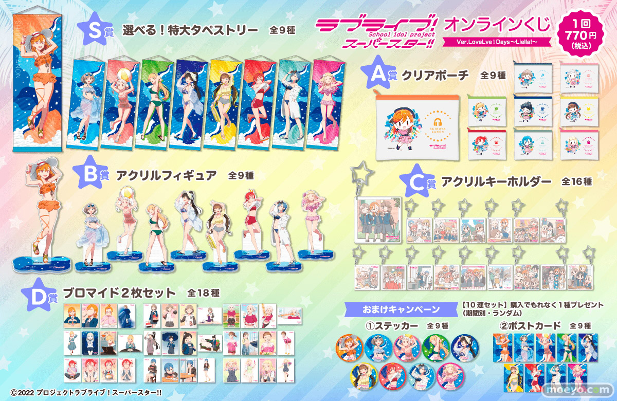 商品は、「LoveLive!Days」で活躍中のイラストレーター・2C=がろあ先生による、Liella!メンバーの新規描き下ろし水着イラストを使用したオリジナルグッズとなります。個性あふれる各メンバーの描きおろしイラストを使用した商品や、これまで「LoveLive!Days」等の誌面を彩ったイラストを集めた商品などが盛りだくさん! また期間中に“リツイートキャンペーン”として、くじ引き堂のTwitter公式アカウントをフォロー&リツイートすると、抽選で3名様に「D賞 ブロマイド2枚セット全18種セット」をプレゼント。 この機会をお見逃しなく!!