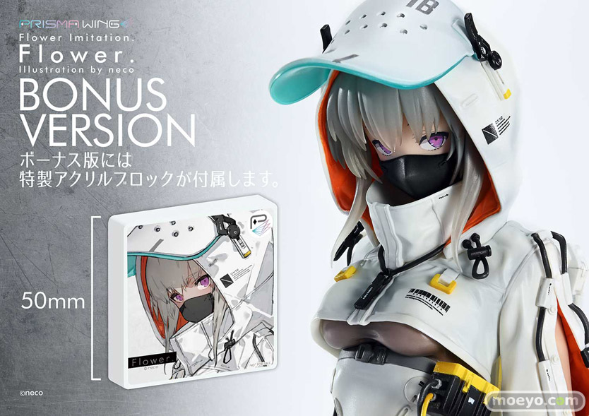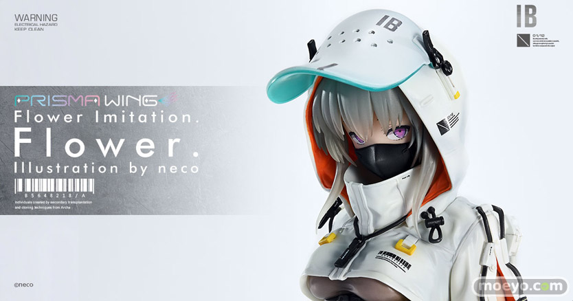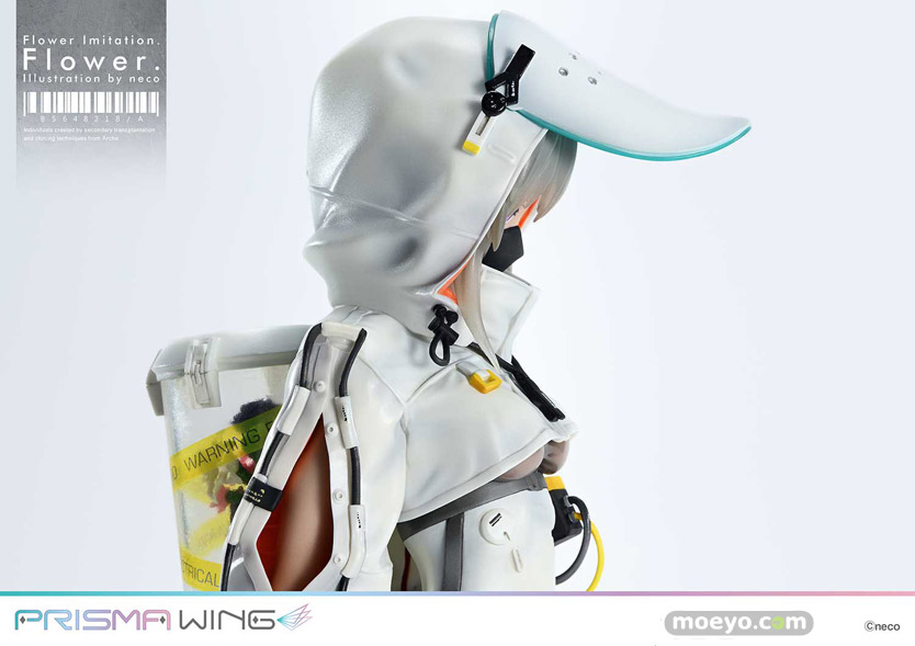 プライム1スタジオの新作美少女フィギュア「PRISMA WING Flower Imitation. Flower. Illustration by neco」が予約受付開始!『荒涼とした未来都市、マスクやフードで隠した感情、背中でたおやかに咲く花々。人気イラストレーターneco氏のオリジナルイラストをフィギュアした、「Flower.」がついに登場!バイザーとマスクの間に見える瞳はクールな印象。neco氏のタッチを高品質なアイプリントで再現しました。ハイトーンのグレージュが美しい髪色も、透明感あふれる肌とマッチするよう塗装にこだわっています。またマスクを外した素顔のフェイスパーツも付属。こちらも感情の機微を捉えた仕上がりです。』というもので、原型制作はカーブモデルズさん。彩色はえこしさん。そのサンプルの様子を、画像レビューとしてお伝えします!