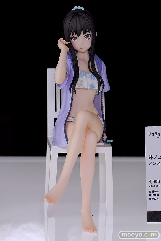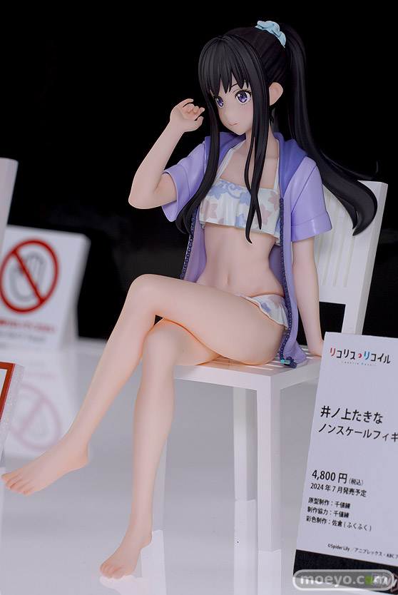 いよいよ明日(10月29日)予約締切となる、価格が税込4,800円とリーズナブルなアニプレックスの新作美少女フィギュア「TVアニメ「リコリス・リコイル」井ノ上たきな」の彩色サンプルが、「メガホビEXPO2023 It’s SHOW TIME!!」の会場で展示!『スラッとした脚を組んで座る、水着姿のたきなが立体化!美しい黒髪をポニーテールでまとめつつ、どこか少しあどけない表情のたきなに仕上げました。パーカーから見える白い水着や細い腰など、細かな部分までこだわった造形にも注目です。』というもので、原型制作は千値練さん。彩色は佐倉(ふくふく)さん。その展示の様子を画像レビューとしてお伝えします!