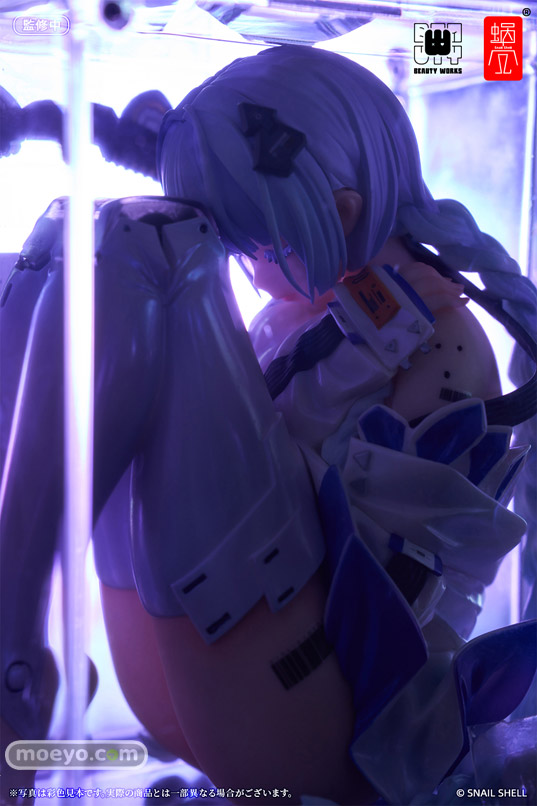 蝸之殼Snail Shellの新作美少女フィギュア「箱入り少女」が予約受付開始!『本商品は色と質感の多層変化を体験できる究極の逸品となります。服にはパール塗装が施されており、虹色に反射します。青⇔紫の偏光塗装の上にマイカ塗装を追加し、更に光沢クリアでコーティングしているため、視覚の情報量が膨大な仕上がりとなっています。肌色はグラデーション塗装となっていて、手足の爪には光沢クリアを吹きかけております。猫耳とデータカードはメタリック塗装で本物の質感を演出しています。』というもので、クリアボックスはマグネット接続となっています。そのサンプルの様子を、画像レビューとしてお伝えします!