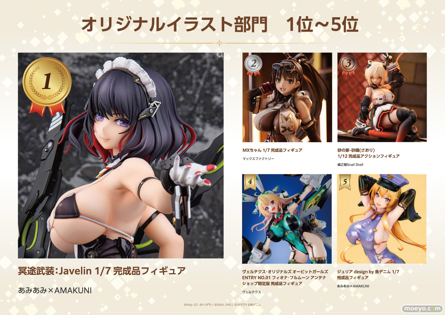 アニメやゲームなどの原作を持たず、オリジナルの世界観で起こされたイラストを基に立体化されたフィギュア部門です。 総合ランキングでも上位に食い込むほどの人気商品も次々に登場しています