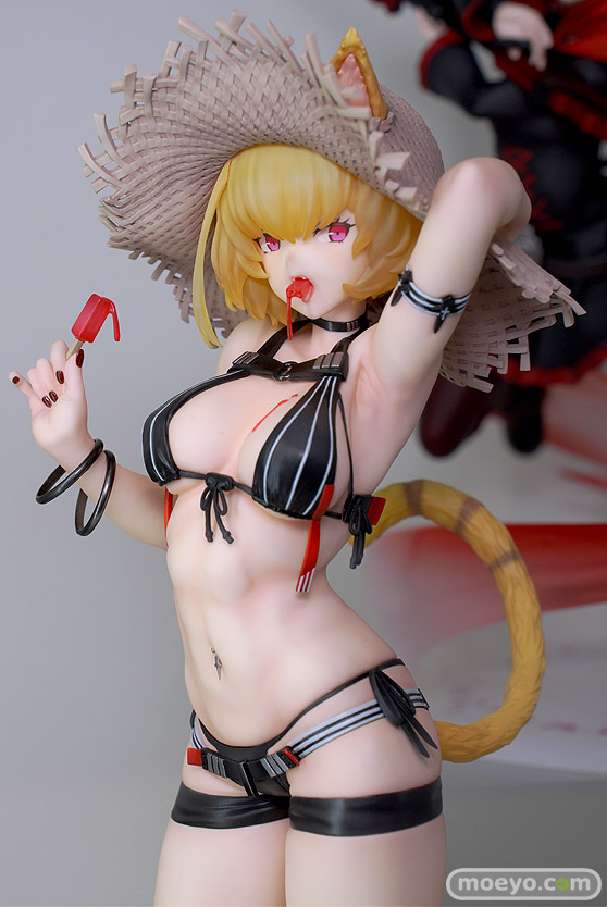 キャラクター原案・so-bin氏のイラストを基にケモミミ&尻尾を備えた水着姿で立体化しました。黒を基調とした露出度の高い水着とモデルのような肉体美のコントラストや余裕のある表情、そして胸元に落ちたアイスキャンディの雫など、イラストの魅力を最大限引き出しました。