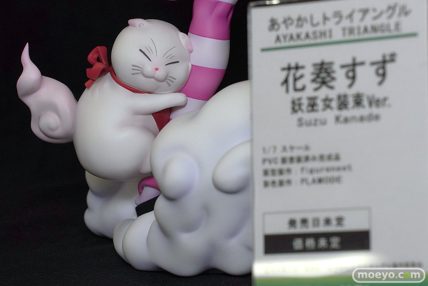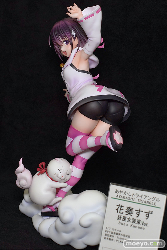 【宮沢展示会45】ベルファイン新作美少女フィギュア「あやかしトライアングル 花奏すず 妖巫女装束Ver.」予約受付開始!ベルファインの新作美少女フィギュア「あやかしトライアングル 花奏すず 妖巫女装束Ver.」が予約受付開始!『TVアニメ『あやかしトライアングル』より、ヒロイン花奏すずの登場です。彼女専用衣装の妖巫女装束(あやかしみこしょうぞく)に変化した瞬間を躍動感あるポーズで再現しました。足元には、妖巫女の力に引き寄せられた「妖の王」であるシロガネが付いて来ます。』というもので、原型製作(本体)はfigureneetさん。彩色製作はPLAMODEさん。「宮沢模型 第45回 商売繁盛セール」の会場で展示されていた彩色サンプルの様子を、画像レビューとしてお伝えします!