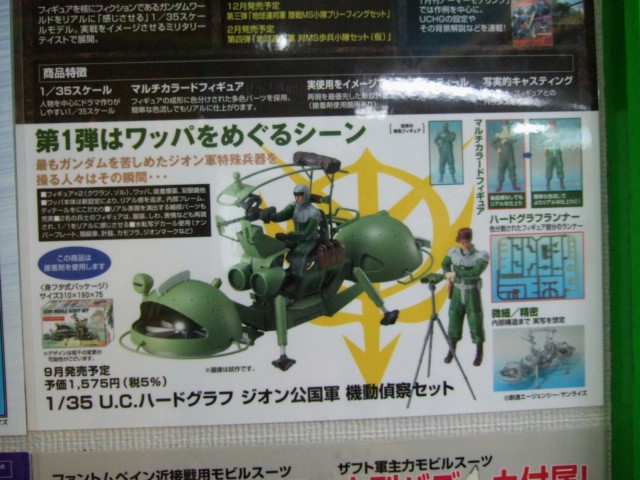 これは、「戦ったのはモビルスーツだけではない・・・・サンライズとバンダイホビー事業部とが共同プロデュース。ガンダムの世界を写実的に立体再現。四半世紀にも及び構築されて来たガンダム世界。熱い視線の向こうには「そのガンダム世界を忠実にする」という夢があった。これは、その視点より1年戦争を再解釈するサンライズの新しいプロジェクトである。考証には、ガンダムシリーズの精鋭スタッフが参加。立体で表現される新しい宇宙世紀を体験せよ。」というもので、ガンダムの世界でミリタリーモデルを作ったらってコンセプトみたいです。