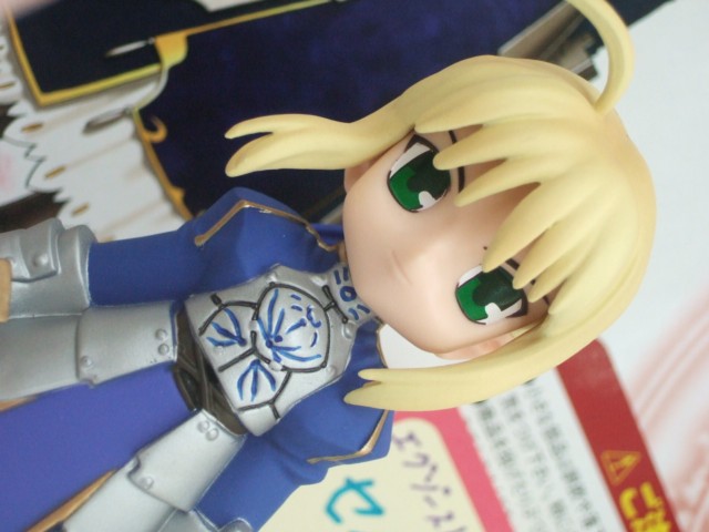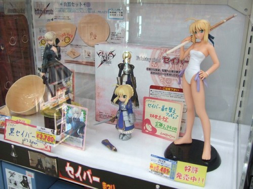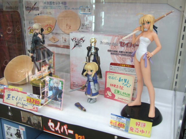 キャラシティ5Fにて、エグゾースト「Fate/stay night セイバー着せ替えフィギュア」(AM)の鎧姿でのサンプル展示が、アルターの黒セイバー(参考レビュー)、クレイズの水着セイバー(参考レビュー)と並べられて開始していました。これは、白水着姿のセイバーさんの本体をベースに、鎧、私服が着せ替え可能で、エクスカリバー、アヴァロン(鞘)、おでんも付属するものです。